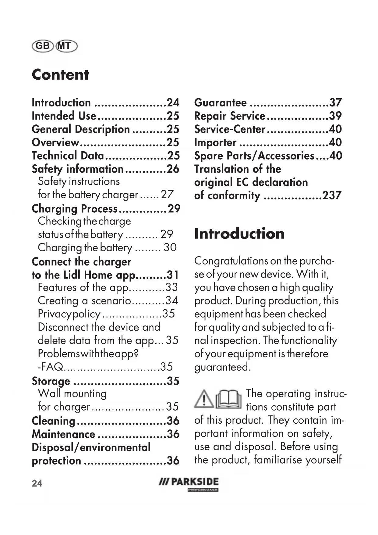 - Spare Parts/Accessories Introduction Congratulations on the purcha- se of your new device. With it, you have chosen a high quality product. During production, this equipment has been checked for quality and subjected to a - nal inspection. The functionality of your equipment is therefore guaranteed. The operating instruc- tions constitute part of this product. They contain im- portant information on safety, use and disposal. Before using the product, familiarise yourself25 GB MT with all of the operating and sa- fety instructions. Use the product only as described and for the applications specied. Keep this manual safely and in the event that the product is passed on, hand over all documents to the third party. Intended Use The charger is to be used in conjunction with a rechargeab- le battery from the (Parkside) X20VTeam series. Any other use can damage the device and thus pose a substantial risk to the user. This device is not suitable for commercial use. The warranty is void in the case of commercial use. The manufac- turer is not liable for damage caused by improper use or in- correct operation. General Description The illustrations can be found on the front fold-out page. Overview 1 Release button 2 Button for the charge status display 3 Battery charge level indicator 4 Rechargeable battery 5 Charger 6 Control display on charger 7 60% button 8 ECO button 9 Wi-Fi display Battery is not included. Technical Data Battery Charger p. 40