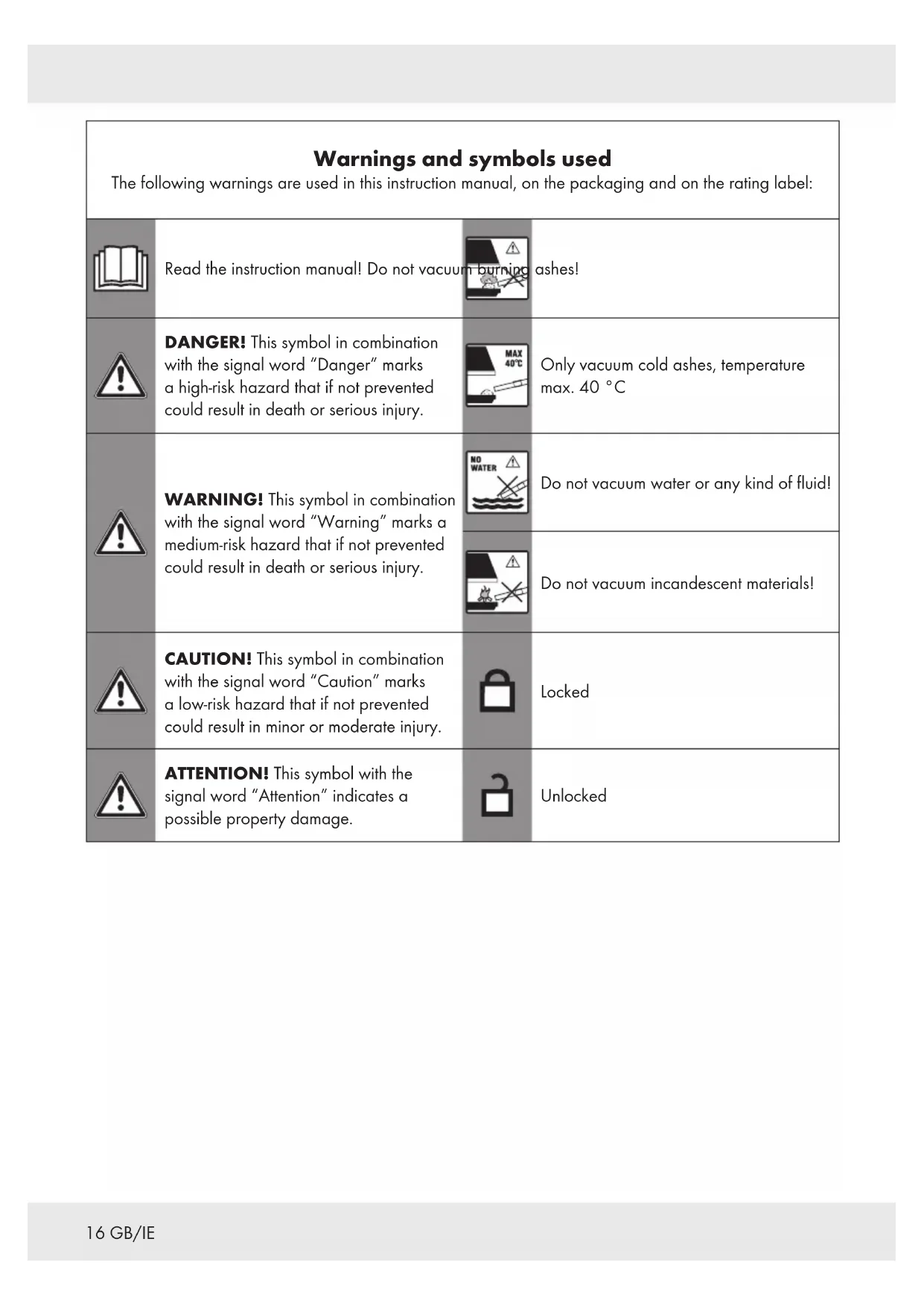 WARNING! Risk of injury! The product is not suitable for vacuuming the following materials: –Water and other liquids, –burning ashes, –any material with a temperature above 40 °C –incandescent materials Defective components must always be replaced by original spare parts.20 GB/IE Before first use
