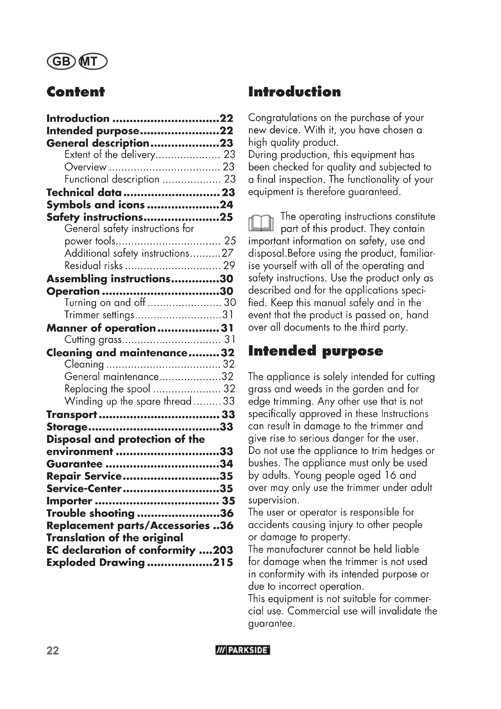 - Throw the cut grass on the compost. Do not throw it in the normal household waste.34 GB MT Guarantee Dear Customer, This equipment is provided with a 3-year guarantee from the date of purchase. In case of defects, you have statutory rights against the seller of the product. These statutory rights are not restricted by our guarantee presented below. Terms of Guarantee The term of the guarantee begins on the date of purchase. Please retain the original receipt. This document is required as proof of purchase. If a material or manufacturing defect occurs within three years of the date of purchase of this product, we will repair or replace – at our choice – the product for you free of charge. This guarantee requires the defec- tive equipment and proof of purchase to be presented within the three-year period with a brief written description of what consti- tutes the defect and when it occurred. If the defect is covered by our guarantee, you will receive either the repaired product or a new product. No new guarantee period be- gins on repair or replacement of the product. Guarantee Period and Statutory Claims for Defects The guarantee period is not extended by the guarantee service. This also applies for replaced or repaired parts. Any damages and defects already present at the time of purchase must be reported immediately af- ter unpacking. Repairs arising after expiry of the guarantee period are chargeable. Guarantee Cover The equipment has been carefully pro- duced in accordance with strict quality guidelines and conscientiously checked prior to delivery. The guarantee applies for all material and manufacturing defects. This guarantee does not extend to cover product parts that are subject to normal wear and may there- fore be considered as wearing parts (e.g. Spool) or to cover damage to breakable parts (e.g. battery, charger, cutting plate, protective housing, switches). This guarantee shall be invalid if the prod- uct has been damaged, used incorrectly or not maintained. Precise adherence to all of the instructions specied in the operating manual is required for proper use of the product. Intended uses and actions against which the operating manual advises or warns must be categorically avoided. The product is designed only for private and not commercial use. The guarantee will be invalidated in case of misuse or improper handling, use of force, or inter- ventions not undertaken by our authorised service branch. Processing in Case of Guarantee To ensure quick handling of you issue, please follow the following directions: