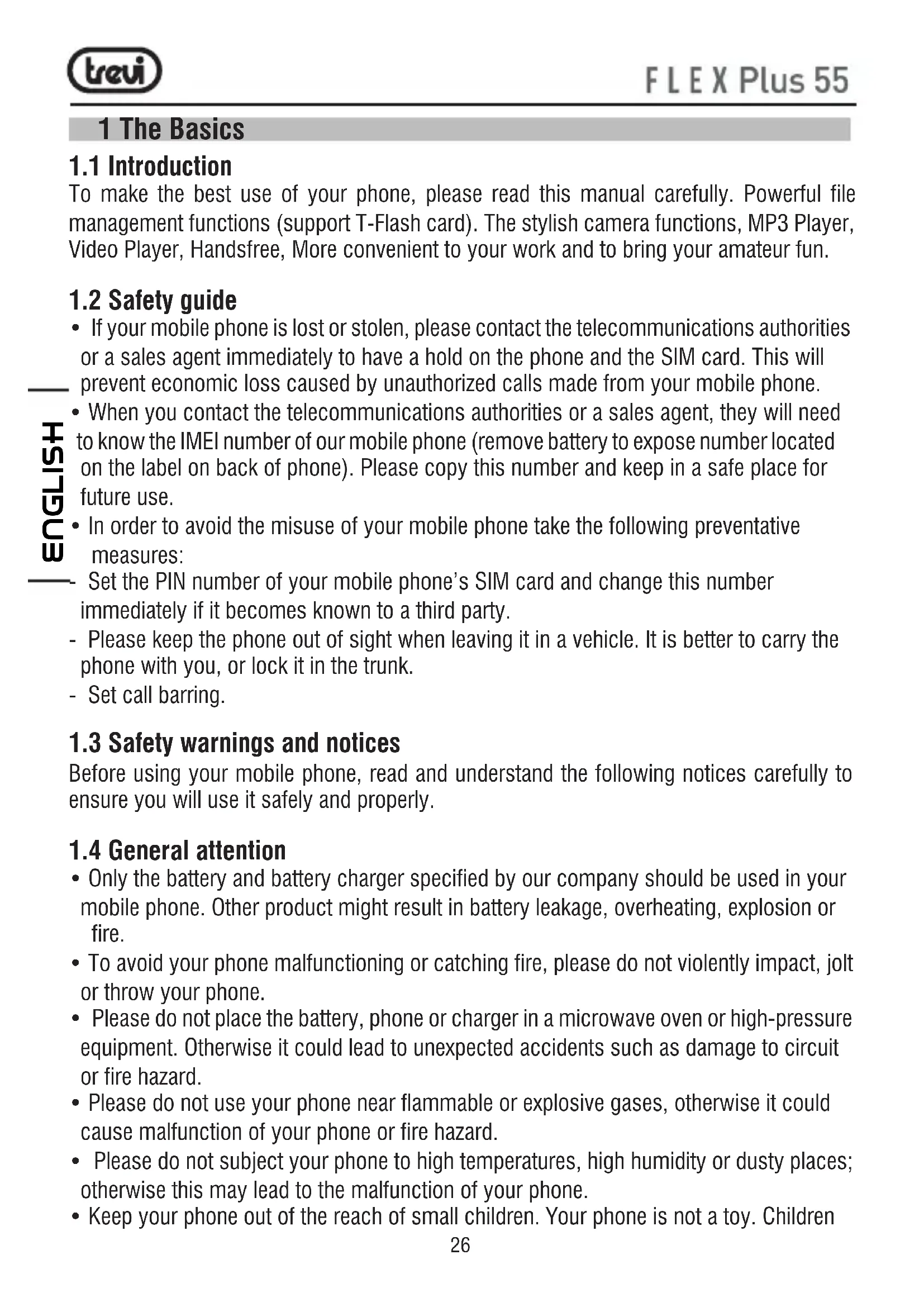 An SIM card carries useful information, including your mobile phone number, PIN (Personal Identification Number), PUK (PIN Unlocking Key), IMSI (International Mobile Subscriber Identity), network information, contacts data, and short messages data. Note: After powering off your mobile phone, wait for a few seconds before removing or inserting an SIM card. Exercise caution when operating an SIM card, as friction or bending will damage the SIM card. Properly keep the mobile phone and its fittings such as the SIM cards beyond children’s reach. Installation - Hold the End key for a while to power off the mobile phone - Push the back cover above the battery and remove it. - Pull the left battery buckle outward and then lift the battery away. - Insert the SIM card into the SIM card slot lightly with the corner cutting of the card aligning to the notch of the slot and the gold plate of the card facing download, till the SIM card cannot be further pushed in. - With the metallic contacts of the battery facing the metallic contacts in the battery slot, press the battery down until it locks into place. - Using code The mobile phone and the SIM cards support sorts of passwords, in order to prevent the phone and the SIM cards from being misused. When you are prompted to input any ENGLISH30 of the codes mentioned below, just input the correct code and then press the ok key. If you input a wrong code, press the Right soft key to clear it and then input the correct code. - Phone lock code The phone lock code may be set to prevent your mobile phone from being misused. In general, this code is provided along with the mobile phone by the manufacturer. The initial phone lock code is set to 0000 by the manufacturer. If the phone lock code is set, you need to input the phone lock code when powering on the mobile phone. - PIN The PIN (Personal identification number, 4 to 8 digits) code prevents your SIM card from being used by unauthorized people. In general, the PIN is supplied with SIM card by the network operator. If PIN check is enabled, you need to input the PIN each time when you power on your mobile phone. The SIM card will be locked if you input wrong PIN code for three times. Unlocking methods as follows: - Input the correct PUK according to the screen tips to unlock the SIM card. - Then input the new PIN and press the ok key. - Input the new PIN again and then press the ok key. - If the input PUK is correct, the SIM card will be unlocked and the PIN will be reset. Note: The SIM card will be locked if you input wrong PIN code for three times. To unlock the SIM card, you need to input the PUK. In general, the PUK can be obtained from the network operator. - PUK The PUK code (Personal Unlocking Key) is required to change a blocked PIN. It is supplied with SIM card. If not, contact your network operator. If you input wrong PUK code for 10 times, SIM card will be invalid. Please contact the network operator to replace the SIM card. Note regard the use of micro-SIM adapter on TREVI products The slots for SIM cards are designed to accommodate only the consideration SIM format. The use of SIM (micro or nano) with its adapter and ‘not recommended as it can cause damage to the device and the micro/nano SIM itself.