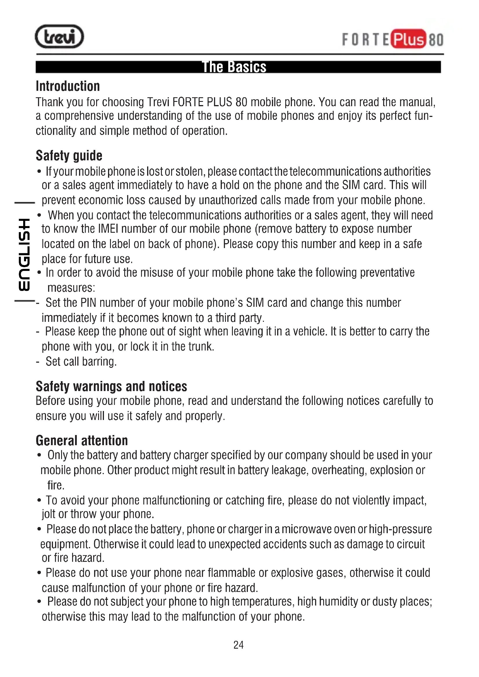 with navigation buttons (11) and confirm with the central button (11); Note: Some settings may not be available, this may be due to your contract or your manager. Phone settings Date and time setting, language, quick key setting, automatic power on and off and power management. ENGLISH32 Phone settings - Restore factory settings You can recover the phone into the initial settings with this function. The default pas- sword is 1234. Display Background setting, Display setting, contrast, backlight, backlight time and key lock. Security PIN activation/deactivation, PIN change, phone lock, password change, Blacklist. Connections Activation and setting of the GPRS service. Information on disposal of battery Whatever type of battery used up, it should never be placed in household waste, fire or water. Each type of battery should be collected, recycled or disposed of at an appropriate dedicated collection points. USERS INFORMATION pursuant to Legislative Decree No. 49 of March 14, 2014 “Implementation of Directive 2012/19/EU on Waste Electrical and Electronic Equipment (RAEE)”. This wheeled bin symbol on the product indicates that at the end of its life must be collected separately from other waste. The user must, therefore, take the remote control integrates the essential components that got to its life to the appropriate differentiated collection centers for electronic and electro-technical waste, or return it to the dealer when purchasing a new appliance of equivalent type, in terms of one to one, or one to zero for equipment having longer side of less than 25cm. Appropriate separate collection for the decommissioned equipment for recycling, processing and environmentally compatible disposal helps prevent negative impact on the environment and human health and promotes recycling of the materials making up the product. Illegal dumping of the product by the user entails the application of administrative sanctions stated in Legislative Decree n. Legislative Decree No. 49 of March 14, 2014. TREVI pursues a policy of continuous research and development, the products may have different features from those described. ENGLISH33 Technical specifications Standard:............................................................................GSM - GPRS GSM frequencies: ........................... Quad Band 850/900/1800/1900MHz Display: ..................................................................................... 2,4 Inch FM Band: ....................................................................... 87,5 - 108 MHz Battery: .........................................rechargeable Lithium 3,7V- 2000mAh Bluetooth: .......................................................................................V 2.0 Bluetooth transmission power: .....................................................2,5mW Bluetooth band transmission: ...................................................... 2,4GHz Dimensions: ....................................................................59x130x20mm Weight: .................................................................... 160gr (with battery) FAQS and solutions If you have any questions about the phone, please find the solutions from the table below. Note: - Please, note, the telephone does not work with telephone providers that use the UMTS technology. FAQs Causes Solutions Poor reception When you use your phone at poor reception areas, like near high rise buildings or base rooms, the radio wave cannot be transmitted. Avoid this as far as you can. When you use your phone at network traffic congestion, such as working time and off-duty time, the congestion can result in poor reception. Avoid this as far as you can. This is related to the distance to base station in question. You may to provide service coverage map. Echoes or noises The trunk line of network is in bad condition. It is a regional problem. Hang off the call and dial again. Choose another better line. In some areas, the call lines are in bad condition. Shorter standby time The standby time is relevant to network settings. In poor reception areas, turn off your phone temporarily. Replace the batteries Change with a new battery. When no signals are received, your phone will continue searching for base stations, thus consuming a large amount of battery power and reducing standby time. Use your phone at strong signal areas or Turn off the phone temporarily. ENGLISH34 Failed to turn on your phone The battery power is used up. Check the battery power level or charge the battery. SIM card error The SIM card is damaged. Contact your network service provider. The SIM card is not properly installed. Ensure the SIM card is properly installed. Failed to connect to the network The SIM card is invalid. Contact your network service provider. Beyond the GSM coverage. Consult the network service provider for service areas. The signal is feeble. Retry at a stronger signal area. Failed to make a call The call barring feature is used. Cancel the call barring settings. The fixed dialing number feature is used. Cancel the fixed dialing number settings. PIN code error Enter incorrect PIN codes for three times in succession. Contact your network service provider. Failed to charge the battery The battery or the charger is damaged. Change a new battery or charger. Charge the battery when ambient temperature is lower than -10°C or above 55°C. Change the environment. Poor connection. Check whether the plug is properly connected. Failed to add contacts to phonebook The storage space of phonebook is used up. Delete some contacts from the phonebook. Failed to set up some features Your network not provider the services. Contact your network service provider. ENGLISH35 Les Bases Introduction Merci d’avoir choisi le téléphone portable Trevi FORTE PLUS 80. Vous pouvez lire le manuel, comprendre parfaitement l’utilisation des téléphones mobiles et en apprécier la fonctionnalité parfaite et la simplicité d’utilisation. Guide de séc