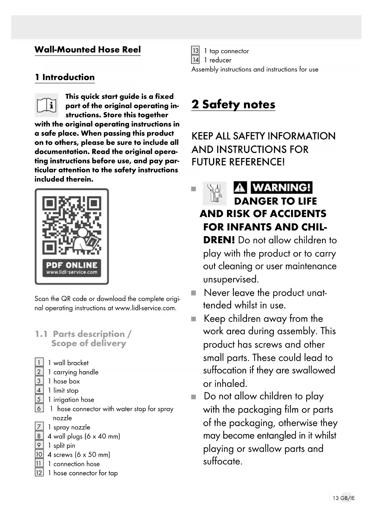 platzsparend an die Wand (siehe Abb. B).13 GB/IE Wall-Mounted Hose Reel 1 Introduction This quick start guide is a fixed part of the original operating in- structions. Store this together with the original operating instructions in a safe place. When passing this product on to others, please be sure to include all documentation. Read the original opera- ting instructions before use, and pay par- ticular attention to the safety instructions included therein. Scan the QR code or download the complete origi- nal operating instructions at www.lidl-service.com.