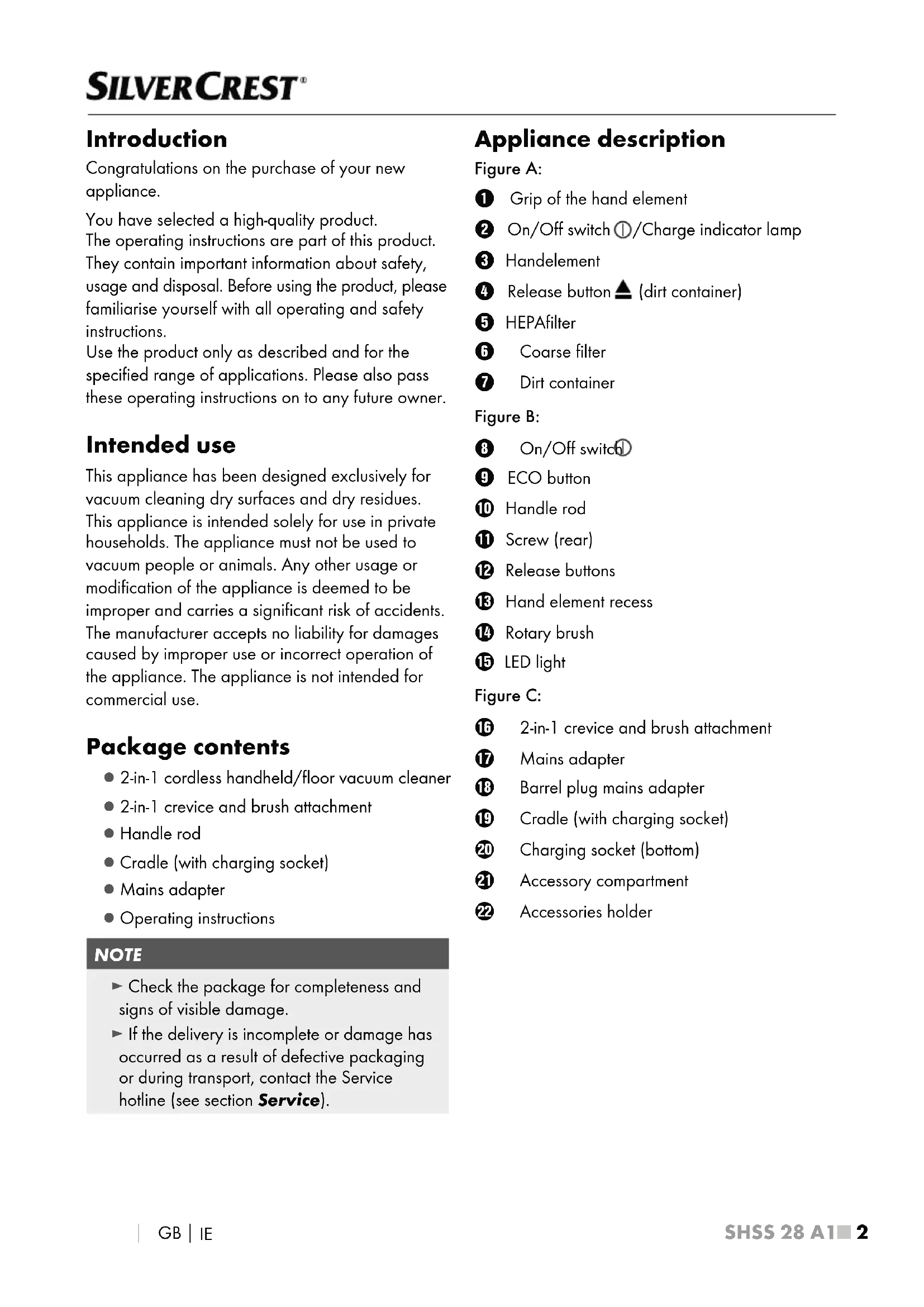 Introduction Congratulations on the purchase of your new appliance. You have selected a high-quality product. The operating instructions are part of this product. They contain important information about safety, usage and disposal. Before using the product, please familiarise yourself with all operating and safety instructions. Use the product only as described and for the specified range of applications. Please also pass these operating instructions on to any future owner. Intended use This appliance has been designed exclusively for vacuum cleaning dry surfaces and dry residues. This appliance is intended solely for use in private households. The appliance must not be used to vacuum people or animals. Any other usage or modification of the appliance is deemed to be improper and carries a significant risk of accidents. The manufacturer accepts no liability for damages caused by improper use or incorrect operation of the appliance. The appliance is not intended for commercial use. Package contents ▯ 2-in-1 cordless handheld/floor vacuum cleaner ▯ 2-in-1 crevice and brush attachment ▯ Handle rod ▯ Cradle (with charging socket) ▯ Mains adapter ▯ Operating instructions NOTE ► Check the package for completeness and signs of visible damage. ► If the delivery is incomplete or damage has occurred as a result of defective packaging or during transport, contact the Service hotline (see section Service). Appliance description Figure A: 1 Grip of the hand element 2 On/Off switch /Charge indicator lamp 3 Hand element 4 Release button (dirt container) 5 HEPA filter 6 Coarse filter 7 Dirt container Figure B: 8 On/Off switch