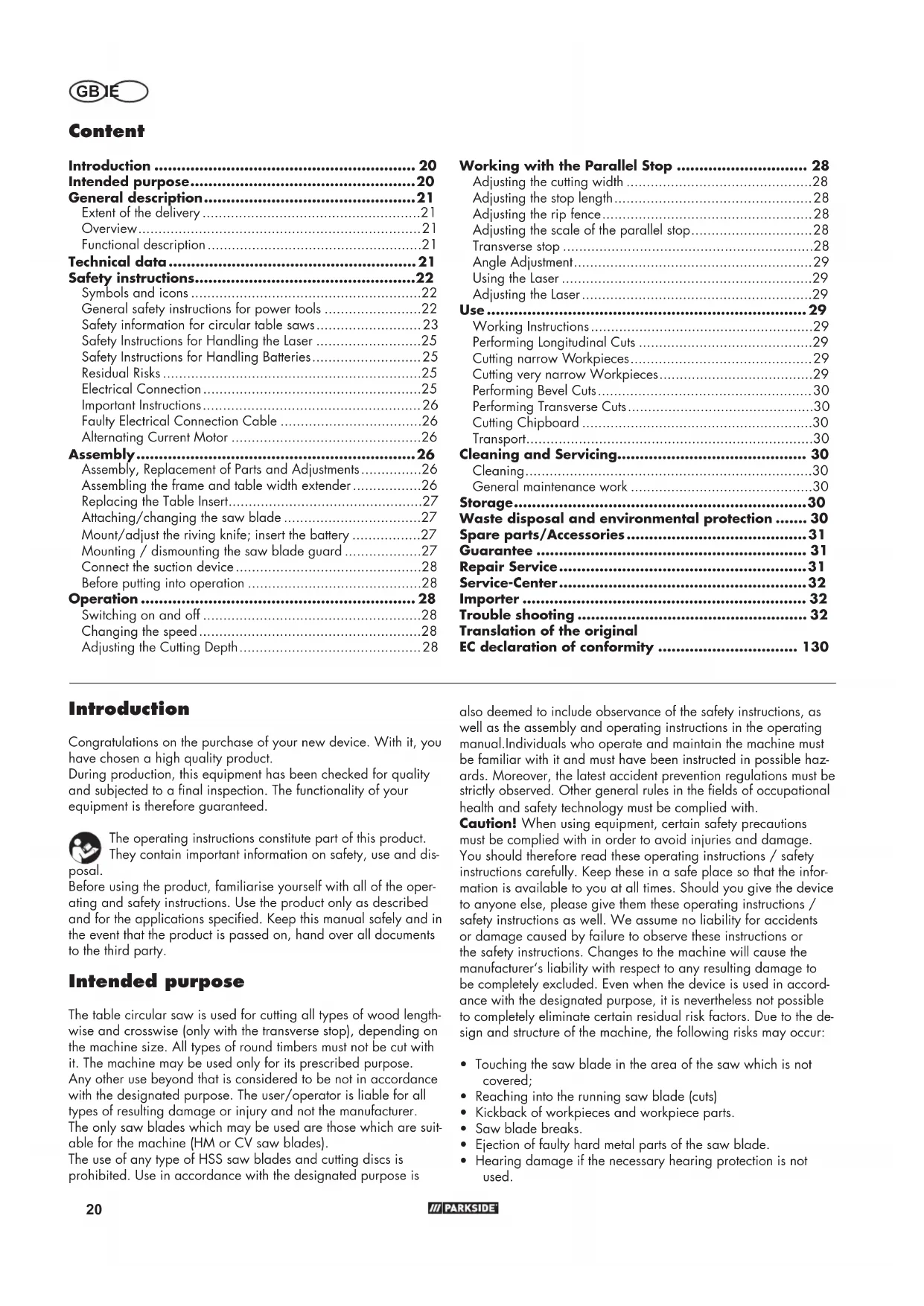 - Introduction Congratulations on the purchase of your new device. With it, you have chosen a high quality product. During production, this equipment has been checked for quality and subjected to a nal inspection. The functionality of your equipment is therefore guaranteed. The operating instructions constitute part of this product. They contain important information on safety, use and dis- posal. Before using the product, familiarise yourself with all of the oper- ating and safety instructions. Use the product only as described and for the applications specied. Keep this manual safely and in the event that the product is passed on, hand over all documents to the third party. Intended purpose The table circular saw is used for cutting all types of wood length- wise and crosswise (only with the transverse stop), depending on the machine size. All types of round timbers must not be cut with it. The machine may be used only for its prescribed purpose. Any other use beyond that is considered to be not in accordance with the designated purpose. The user/operator is liable for all types of resulting damage or injury and not the manufacturer. The only saw blades which may be used are those which are suit- able for the machine (HM or CV saw blades). The use of any type of HSS saw blades and cutting discs is prohibited. Use in accordance with the designated purpose is Translation of the original EC declaration of conformity p. 130