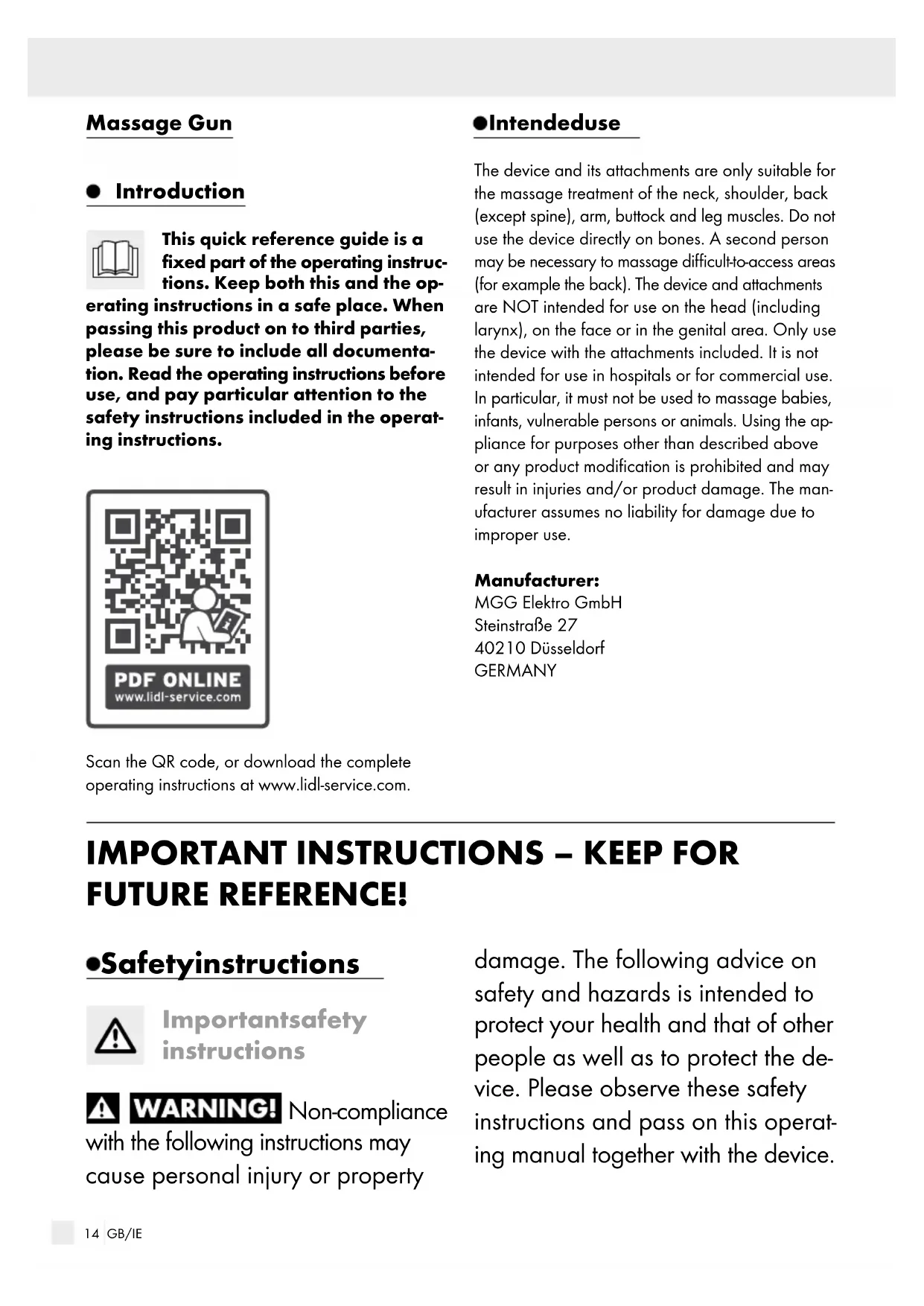 ion. Read the operating instructions bef ore use, and pay particular attention to the safety instructions included in the operat- ing instructions. Scan the QR code, or download the complete operating instructions at www.lidl-service.com. Intended use The device and its attachments are only suitable for the massage treatment of the neck, shoulder, back (except spine), arm, buttock and leg muscles. Do not use the device directly on bones. A second person may be necessary to massage difficult-to-access areas (for example the back). The device and attachments are NOT intended for use on the head (including larynx), on the face or in the genital area. Only use the device with the attachments included. It is not intended for use in hospitals or for commercial use. In particular, it must not be used to massage babies, infants, vulnerable persons or animals. Using the ap- pliance for purposes other than described above or any product modification is prohibited and may result in injuries and/or product damage. The man- ufacturer assumes no liability for damage due to improper use. Manufacturer: MGG Elektro GmbH Steinstraße 27 40210 Düsseldorf GERMANY