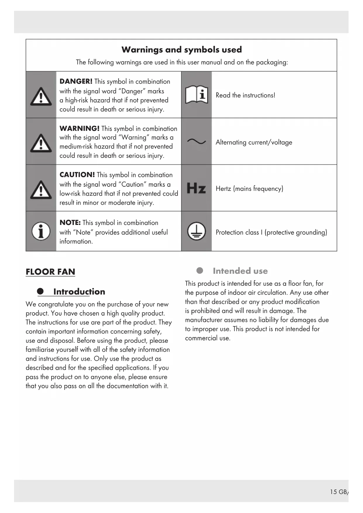 CHILDREN! Never leave children unsupervised with the packaging material. The packaging material represents a danger of suffocation. Children frequently underestimate the dangers. Always keep children away from the packaging material.17 GB/IE mDANGER! Risk of electric shock! Do not attempt to repair the product yourself. In case of malfunction, repairs are to be conducted by qualified personnel only. mWARNING! Risk of electric shock! Do not immerse the electrical parts of the product in water or other liquids. Never hold the product under running water. mCAUTION! Risk of electric shock! Never use a damaged product. Disconnect the product from the power supply and contact your retailer if it is damaged. mWARNING! Risk of injury! Avoid contacting moving parts. Wait until all components have completely stopped before touching them. mWARNING! Risk of injury! Switch the product off and disconnect it from the power supply before cleaning work and when not in use. mWARNING! Misuse may lead to injury. Use this product solely in accordance with these instructions. Do not attempt to modify the product in any way. This product can be used by children aged from 8 years and above and persons with reduced physical, sensory or mental capabilities, or lack of experience and knowledge if they have been given supervision or instruction concerning use of the product in a safe way and understand the hazards involved. Children shall not play with the product. Cleaning and user maintenance shall not be made by children without supervision.18 GB/IE Ensure the rated voltage shown on the rating label corresponds with the voltage of the power supply. Do not operate any product with a damaged power cord or plug, when the product malfunctions or has been damaged in any manner. Only use the product in dry indoor rooms. Do not operate the product with wet hands or while standing on a wet floor. Do not touch the power plug with wet hands. Protect the product against heat. Do not place the product close to open flames or heat sources such as stoves or heating appliances. Do not insert fingers or foreign objects in any opening of the product and do not obstruct the air vents. No action is needed from users to shift the product between 50 and 60 Hz. The product adapts itself for both 50 and 60 Hz. Regularly check the power plug and power cord for damage. If the supply cord is damaged, it must be replaced by the manufacturer, its service agent or similarly qualified persons in order to avoid a hazard. Protect the power cord against damages. Do not let it hang over sharp edges, do not squeeze or bend it. Keep the power cord away from hot surfaces and open flames and ensure that nobody can pull on or trip over it unintentionally. If the power cord should overheat, stop using the product and disconnect the product from the electrical outlet. Do not pull the power plug out of the electrical outlet by the power cord. Do not wrap the power cord around the product.19 GB/IE Protect the product, its power cord and power plug against dust, direct sunlight, dripping and splashing water. For safety reasons, it is recommended not to remove the safety grille/guard. However, if you need to remove it, ensure that the product is switched off from the supply mains before removing the grille/guard. Never use the product without the safety grille or with a damaged safety grille. Place the product on a firm, level and stable surface to prevent overturning during operation. Keep the product at least 10 cm away from any objects (curtains, walls, etc.). During use, keep hands, hair, clothing and utensils away from the safety grille to avoid injuries and damage of the product. Never try to move the product while it is operating. Always switch the product off before moving it. Always turn the product off before disconnecting it from the power supply. Unplug the product before cleaning, assembly, and when not in use for long time. Wipe with a dry and soft cloth. Let the product dry completely before connecting it to the power supply and before storage. Allow the product to cool down completely before storage. Store the product in a cool, dry place, protected from moisture and out of the reach of children.20 GB/IE Before first use Unpacking Remove the packaging material, the adhesive label and the protective film. Tilt angle adjustment Adjust the tilt angle by hand (max. 130°). Operation Place the product on a flat and stable surface. Keep a clearance of at least 10 cm around the product. This product is not suitable for use in a cupboard or outdoors. Connect the power plug to a socket-outlet. Turning the product on/off, fan speed adjustment Select your desired fan speed by pressing the corresponding speed button