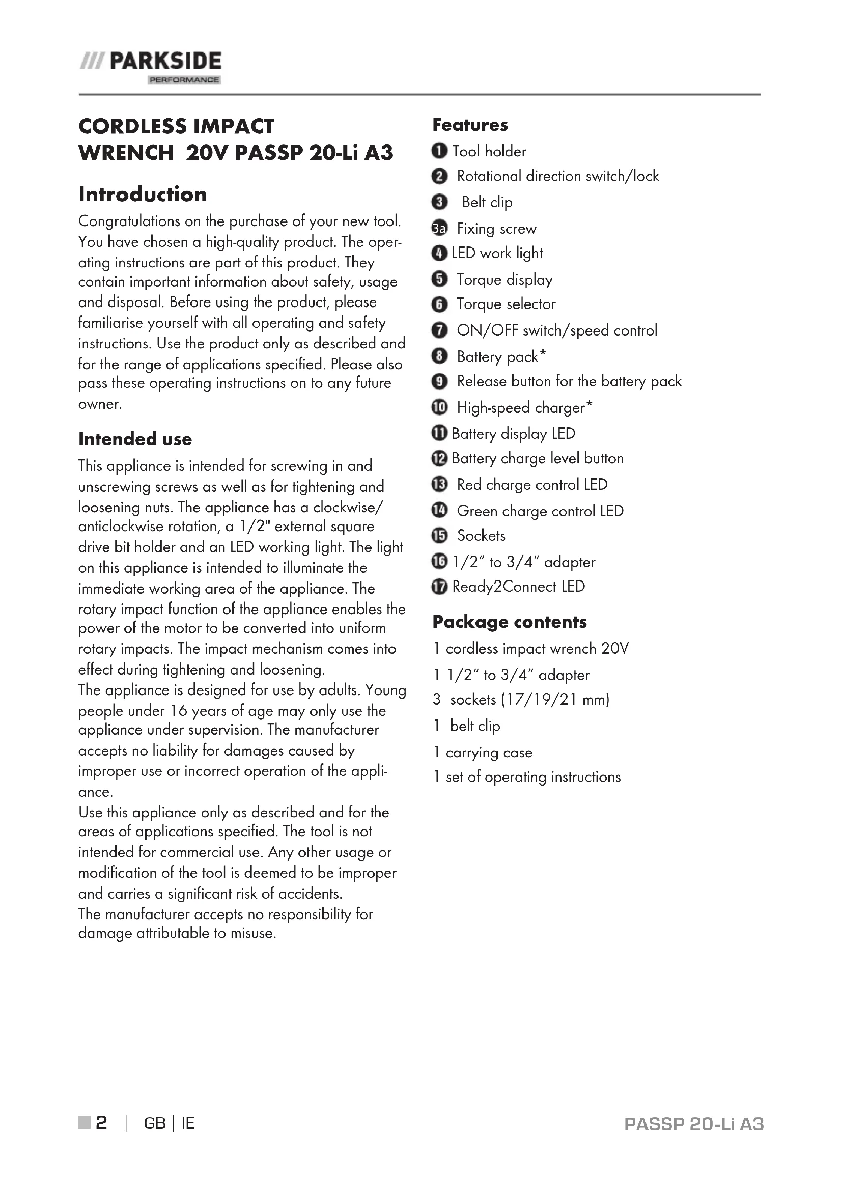 CORDLESS IMPACT WRENCH 20V PASSP 20-Li A3 Introduction Congratulations on the purchase of your new tool. You have chosen a high-quality product. The oper- ating instructions are part of this product. They contain important information about safety, usage and disposal. Before using the product, please familiarise yourself with all operating and safety instructions. Use the product only as described and for the range of applications specified. Please also pass these operating instructions on to any future owner. Intended use This appliance is intended for screwing in and unscrewing screws as well as for tightening and loosening nuts. The appliance has a clockwise/ anticlockwise rotation, a 1/2" external square drive bit holder and an LED working light. The light on this appliance is intended to illuminate the immediate working area of the appliance. The rotary impact function of the appliance enables the power of the motor to be converted into uniform rotary impacts. The impact mechanism comes into effect during tightening and loosening. The appliance is designed for use by adults. Young people under 16 years of age may only use the appliance under supervision. The manufacturer accepts no liability for damages caused by improper use or incorrect operation of the appli- ance. Use this appliance only as described and for the areas of applications specified. The tool is not intended for commercial use. Any other usage or modification of the tool is deemed to be improper and carries a significant risk of accidents. The manufacturer accepts no responsibility for damage attributable to misuse. Features Tool holder Rotational direction switch/lock Belt clip