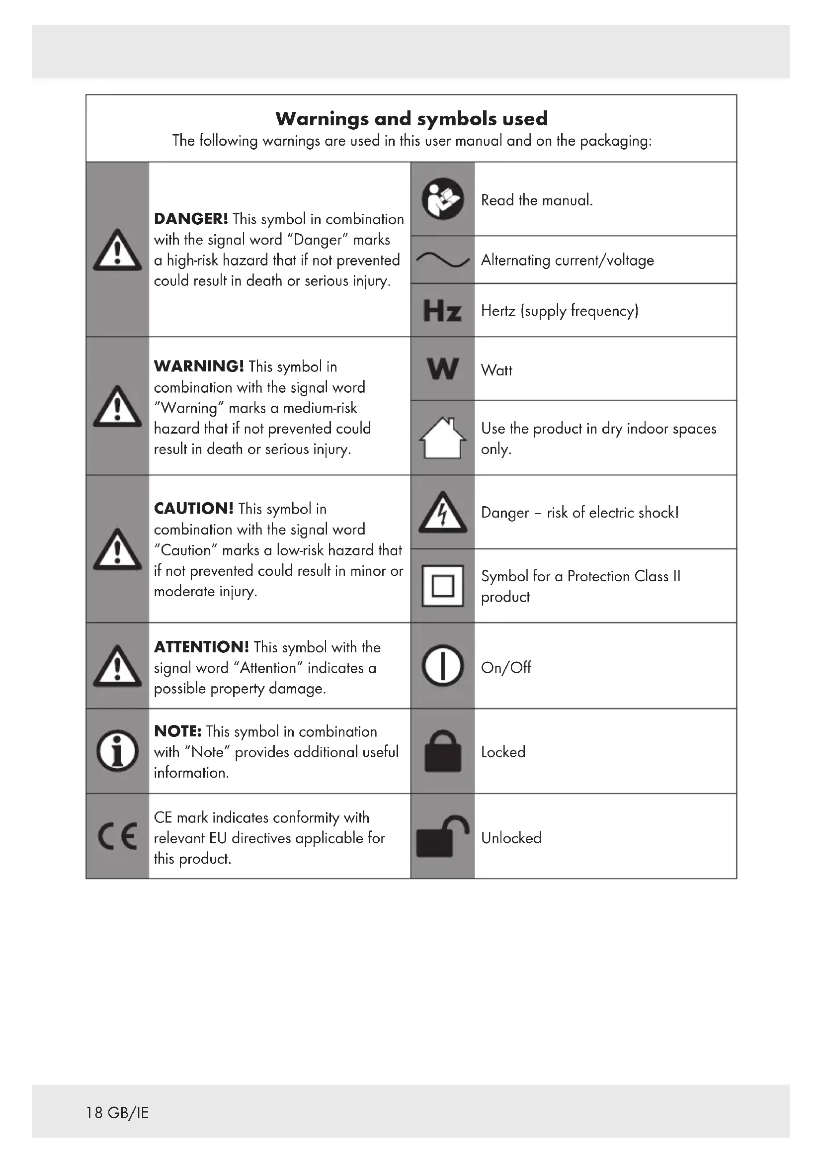 CHILDREN! Never leave children unsupervised with the packaging material. The packaging material represents a danger of suffocation. Children frequently underestimate the dangers. This product can be used by children aged from 8 years and above and persons with reduced physical, sensory or mental capabilities or lack of experience and knowledge if they have been given supervision or instruction concerning use of the product in a safe way and understand the hazards involved. Children shall not play with the product. Cleaning and user maintenance shall not be made by children unless they are older than 8 and supervised.21GB/IE Intended use mWARNING! Risk of injury! Misuse may lead to injury. Use this product solely in accordance with these instructions. Do not attempt to modify the product in any way. Electrical safety mDANGER! Risk of electric shock! Never attempt to repair the product yourself. In case of malfunction, repairs are to be conducted by qualified personnel only. mWARNING! Risk of electric shock! Do not immerse the product’s electrical components in water or other liquids. Never hold the product under running water. mWARNING! Risk of electric shock! Never use a damaged product. Disconnect the product from the socket outlet and contact your retailer if it is damaged. mWARNING! Risk of electric shock! Do not operate the product with wet hands or while standing on a wet floor. mWARNING! Risk of injury! Turn off the product and disconnect it from the power supply before cleaning and when the product is not in use. Do not use the product anymore if it has been dropped. Before connecting the power plug to the power supply: Check that the voltage and the current rating correspond with the power supply details shown on the product’s rating label.22 GB/IE Regularly check the power plug and the power cord for damages. If the power cord is damaged, it must be replaced by the manufacturer, its service agent or similarly qualified persons in order to avoid a hazard. Protect the power cord against damages. Do not let it hang over sharp edges, do not squeeze or bend it. Keep the power cord away from hot surfaces and open flames. Operation Disconnect the power plug from the socket-outlet –when a malfunction occurs, –before attaching/changing accessories, –before cleaning the product, –if you will not use the product for a long time, –during a thunderstorm and –after each use. Disconnect the product from the socket-outlet by pulling the power plug, but not by pulling on the power cord. Defective components must always be replaced by original spare parts. Do not obstruct the ventilation slots during operation. Risk of overheating and damage to the product. Never use the product to absorb water or other liquids, flammable substances or hot/ burning objects. The product is equipped with a thermal fuse that automatically cuts off the power supply if the product overheats. If this safety device has turned off the product, disconnect the power cord from the socket-outlet and let the product cool. Once the product has cooled down, you can connect the power plug back into the socket-outlet and use the product normally.23GB/IE Cleaning and storage mWARNING! Risk of injury! Disconnect the product from the power supply before cleaning work and when not in use. Protect the product, its power cord and power plug against dust, direct sunlight, dripping and splashing water. Store the product in a cool, dry place, protected from moisture and out of the reach of children. Protect the product against heat. Do not place the product close to open flames or heat sources such as stoves or heating appliances. Before first use Remove all packaging material and lay out all separate components in front of you. After unpacking, check the product for visible damage.24 GB/IE Operation Accessories Part Application