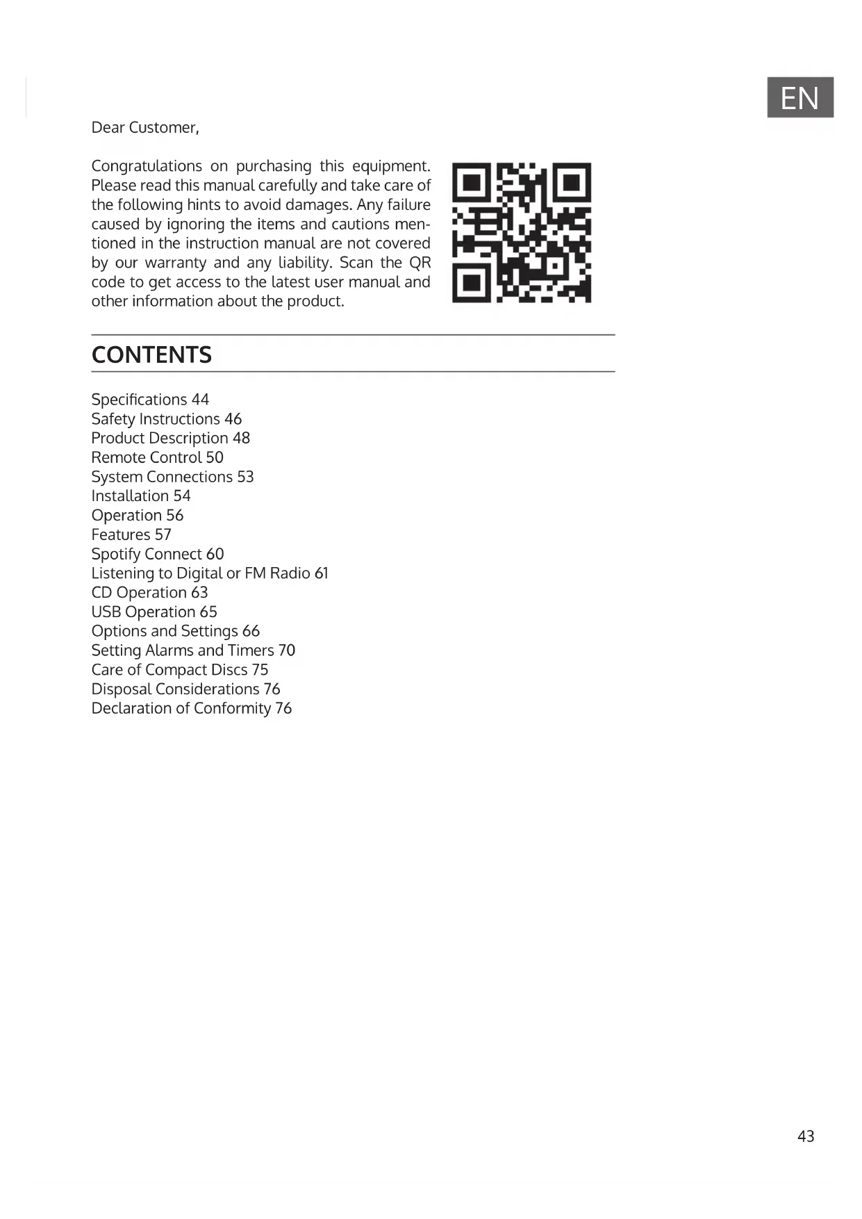CONTENTS Specications 44 Safety Instructions 46 Product Description 48 Remote Control 50 System Connections 53 Installation 54 Operation 56 Features 57 Spotify Connect 60 Listening to Digital or FM Radio 61 CD Operation 63 USB Operation 65 Options and Settings 66 Setting Alarms and Timers 70 Care of Compact Discs 75 Disposal Considerations 76 Declaration of Conformity 76 Dear Customer, Congratulations on purchasing this equipment. Please read this manual carefully and take care of the following hints to avoid damages. Any failure caused by ignoring the items and cautions men- tioned in the instruction manual are not covered by our warranty and any liability. Scan the QR code to get access to the latest user manual and other information about the product.44