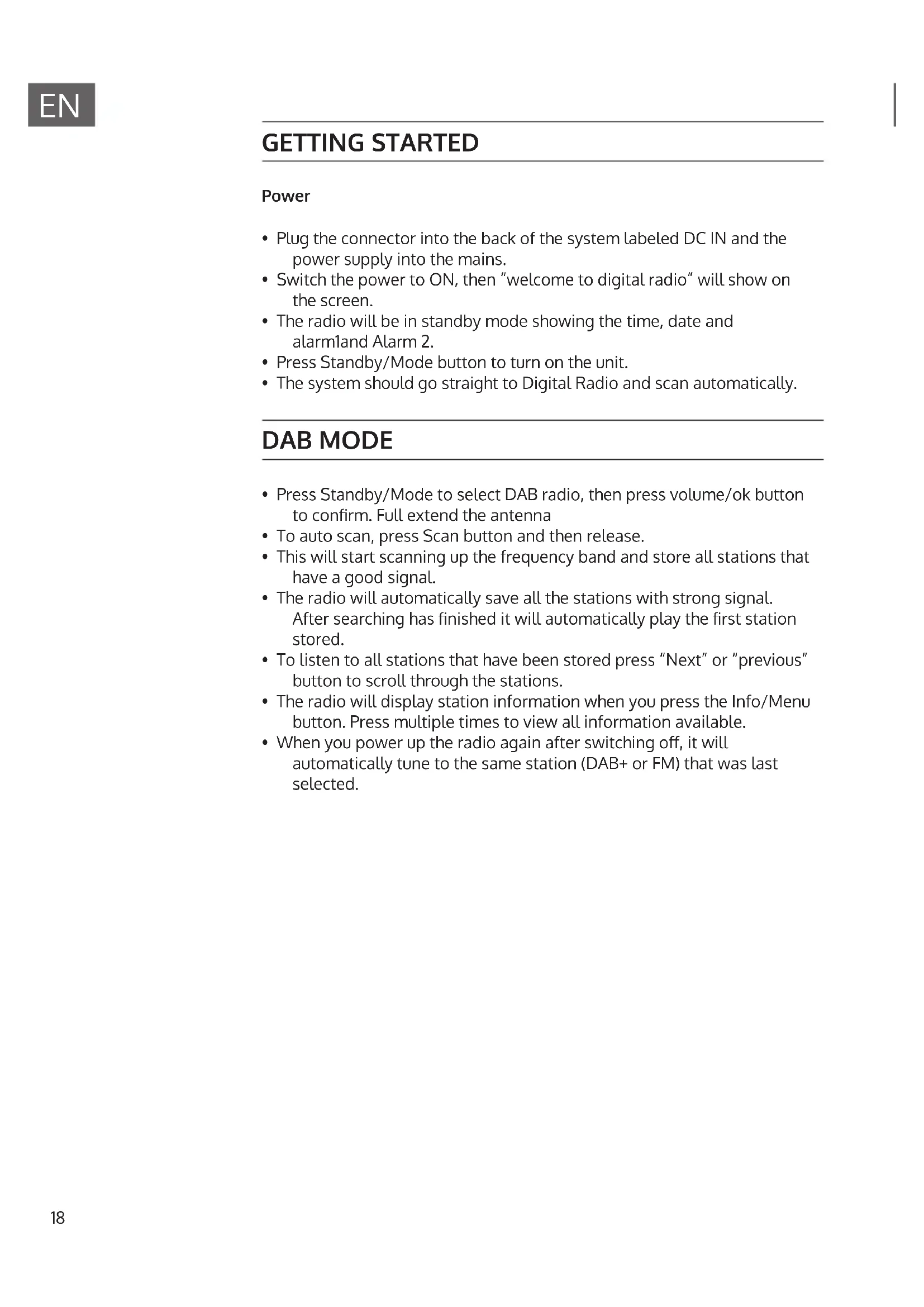 - When you power up the radio again after switching o, it will automatically tune to the same station (DAB+ or FM) that was last selected.19