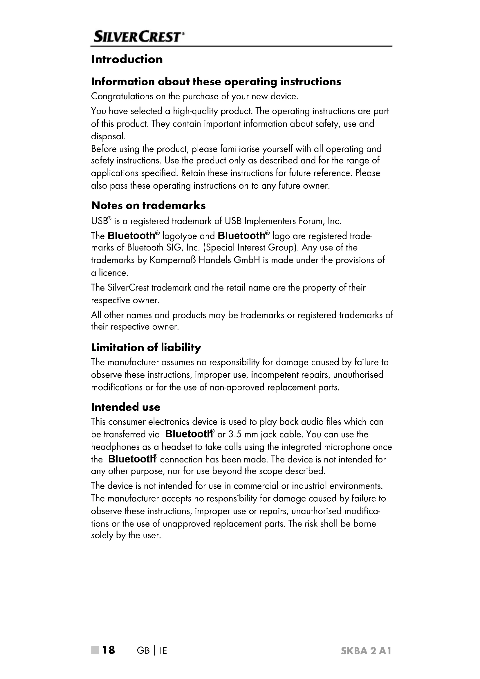 logo are registered trade- marks of Bluetooth SIG, Inc. (Special Interest Group). Any use of the trademarks by Kompernaß Handels GmbH is made under the provisions of a licence. The SilverCrest trademark and the retail name are the property of their respective owner. All other names and products may be trademarks or registered trademarks of their respective owner. Limitation of liability The manufacturer assumes no responsibility for damage caused by failure to observe these instructions, improper use, incompetent repairs, unauthorised modifications or for the use of non-approved replacement parts. Intended use This consumer electronics device is used to play back audio files which can be transferred via Bluetooth