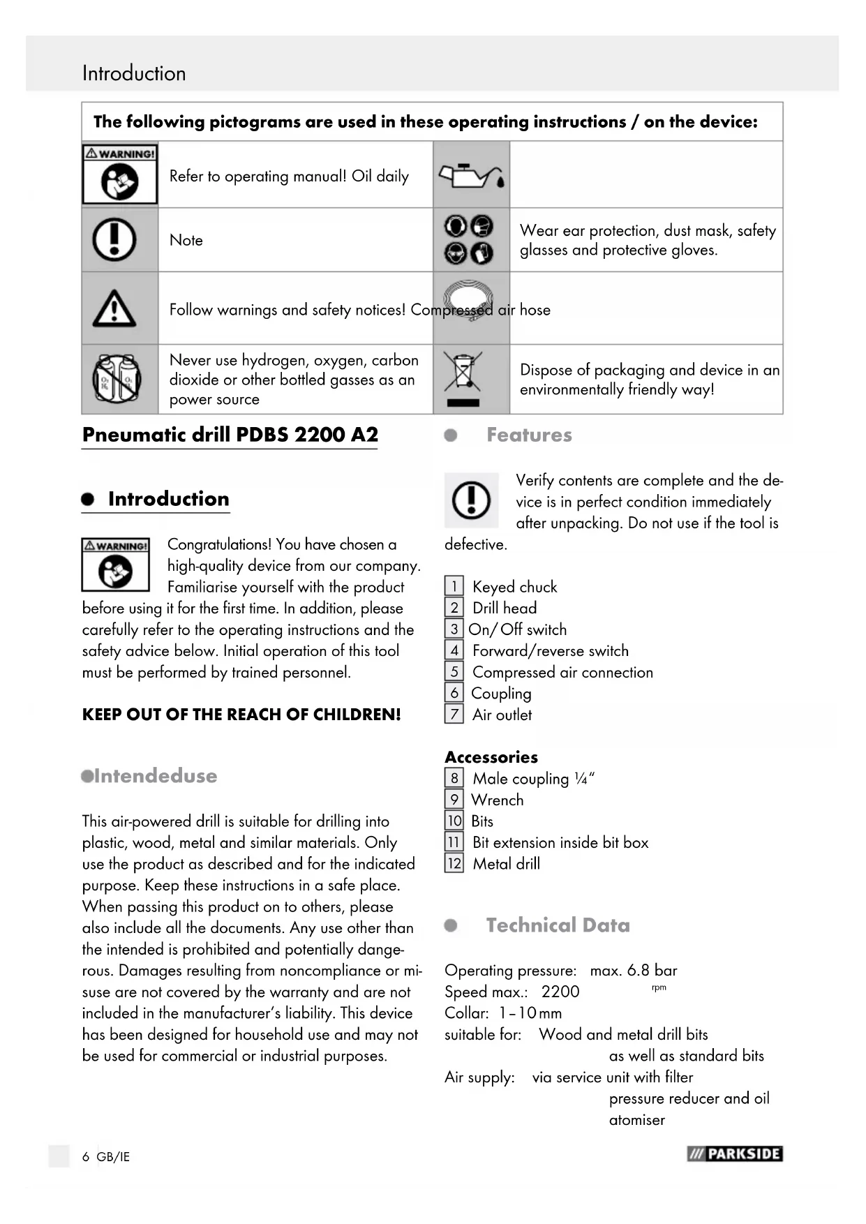 Metal drill Technical Data Operating pressure: max. 6.8 bar Speed max.: 2200 rpm Collar: 1–10 mm suitable for: Wood and metal drill bits as well as standard bits Air supply: via service unit with filter pressure reducer and oil atomiser The following pictograms are used in these operating instructions / on the device: Refer to operating manual! Oil daily Note Wear ear protection, dust mask, safety glasses and protective gloves. Follow warnings and safety notices! Compressed air hose Never use hydrogen, oxygen, carbon dioxide or other bottled gasses as an power source Dispose of packaging and device in an environmentally friendly way! Introduction / Safety information for air tools7 GB/IE Introduction Introduction / Safety information for air tools Required air quality: purified, condensation- free and oil nebulised Compressors: with min. 50 L tank volume Noise parameters (per EN ISO 15744): approx. L