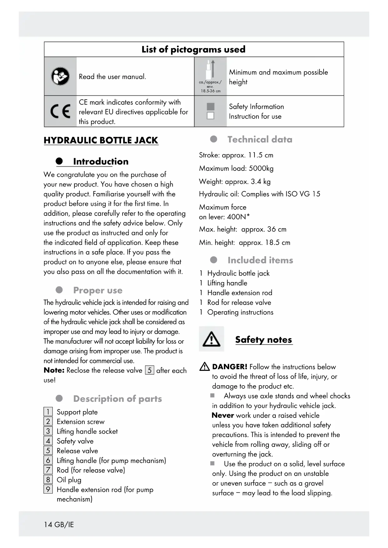 Introduction We congratulate you on the purchase of your new product. You have chosen a high quality product. Familiarise yourself with the product before using it for the first time. In addition, please carefully refer to the operating instructions and the safety advice below. Only use the product as instructed and only for the indicated field of application. Keep these instructions in a safe place. If you pass the product on to anyone else, please ensure that you also pass on all the documentation with it. Proper use The hydraulic vehicle jack is intended for raising and lowering motor vehicles. Other uses or modification of the hydraulic vehicle jack shall be considered as improper use and may lead to injury or damage. The manufacturer will not accept liability for loss or damage arising from improper use. The product is not intended for commercial use. Note: Reclose the release valve [5] after each use! Description of parts [1] Support plate [2] Extension screw [3] Lifting handle socket [4] Safety valve [5] Release valve [6] Lifting handle (for pump mechanism) [7] Rod (for release valve) [8] Oil plug [9] Handle extension rod (for pump mechanism) Technical data Stroke: approx. 11.5 cm Maximum load: 5000kg Weight: approx. 3.4 kg Hydraulic oil: Complies with ISO VG15 Maximum force on lever: 400N* Max. height: approx. 36 cm Min. height: approx. 18.5 cm Included items 1 Hydraulic bottle jack 1 Lifting handle 1 Handle extension rod 1 Rod for release valve 1 Operating instructions Safety notes