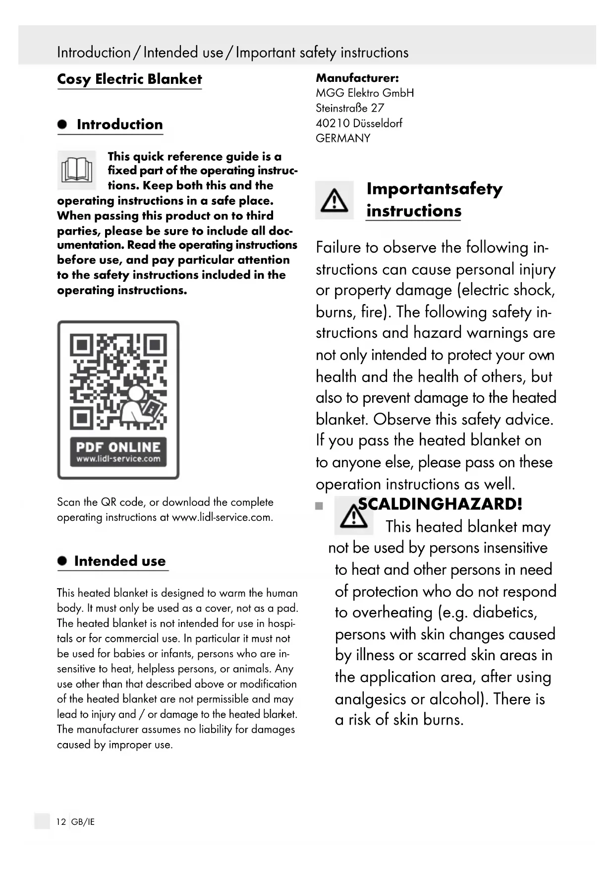 health and the health of others, but also to prevent damage to the heated blanket. Observe this safety advice. If you pass the heated blanket on to anyone else, please pass on these operation instructions as well. SCALDING HAZARD! This heated blanket may not be used by persons insensitive to heat and other persons in need of protection who do not respond to overheating (e.g. diabetics, persons with skin changes caused by illness or scarred skin areas in the application area, after using analgesics or alcohol). There is a risk of skin burns.13 GB/IE Important safety instructions This heated blanket may not be used for very young children (0–3 years), as they are unable to react to overheating. There is a risk of skin burns. The heated blanket may be used by children over 3 years and under 8 years when supervised, if the switch is always set to the lowest temperature level. Otherwise there is a risk of burns. This heated blanket may be used by older children age 8 and up, and persons with diminished physical, sensory or mental ca- pacities or lacking experience and knowledge when supervised and instructed on the safe use of the heated blanket and understand the associated risks. Children must be supervised to ensure they do not play with the heated blanket. There is a risk of injury. Children must not perform clean or maintain the heated blanket without supervision. There is a risk of injury.