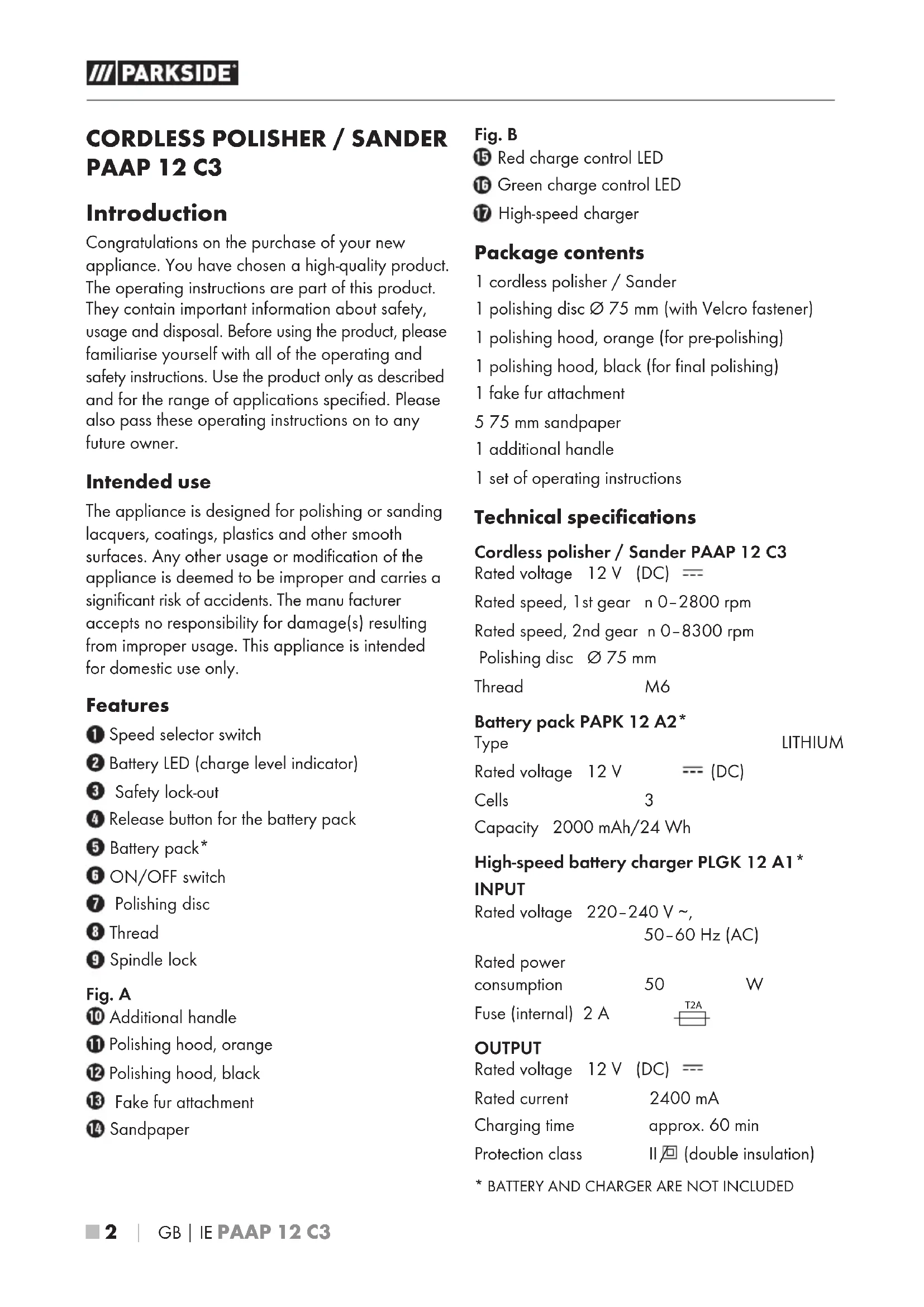 PAAP 12 C3 Introduction Congratulations on the purchase of your new appliance. You have chosen a high-quality product. The operating instructions are part of this product. They contain important information about safety, usage and disposal. Before using the product, please familiarise yourself with all of the operating and safety instructions. Use the product only as described and for the range of applications specified. Please also pass these operating instructions on to any future owner. Intended use The appliance is designed for polishing or sanding lacquers, coatings, plastics and other smooth surfaces. Any other usage or modification of the appliance is deemed to be improper and carries a significant risk of accidents. The manu facturer accepts no responsibility for damage(s) resulting from improper usage. This appliance is intended for domestic use only. Features Speed selector switch Battery LED (charge level indicator) Safety lock-out Release button for the battery pack Battery pack* ON/OFF switch Polishing disc Thread Spindle lock Fig. A Additional handle Polishing hood, orange Polishing hood, black Fake fur attachment Sandpaper Fig. B Red charge control LED Green charge control LED High-speed charger Package contents 1 cordless polisher / Sander 1 polishing disc Ø 75 mm (with Velcro fastener) 1 polishing hood, orange (for pre-polishing) 1 polishing hood, black (for final polishing) 1 fake fur attachment 5 75 mm sandpaper 1 additional handle 1 set of operating instructions Technical specifications Cordless polisher / Sander PAAP 12 C3 Rated voltage 12 V (DC) Rated speed, 1st gear n 0–2800 rpm Rated speed, 2nd gear n 0–8300 rpm Polishing disc Ø 75 mm Thread M6 Battery pack PAPK 12 A2* Type LITHIUM ION Rated voltage 12 V (DC) Cells 3 Capacity 2000 mAh/24 Wh High-speed battery charger PLGK 12 A1* INPUT Rated voltage 220–240 V ∼, 50–60 Hz (AC) Rated power consumption 50 W Fuse (internal) 2 A T2A OUTPUT Rated voltage 12 V (DC) Rated current 2400 mA Charging time approx. 60 min Protection class II / (double insulation)