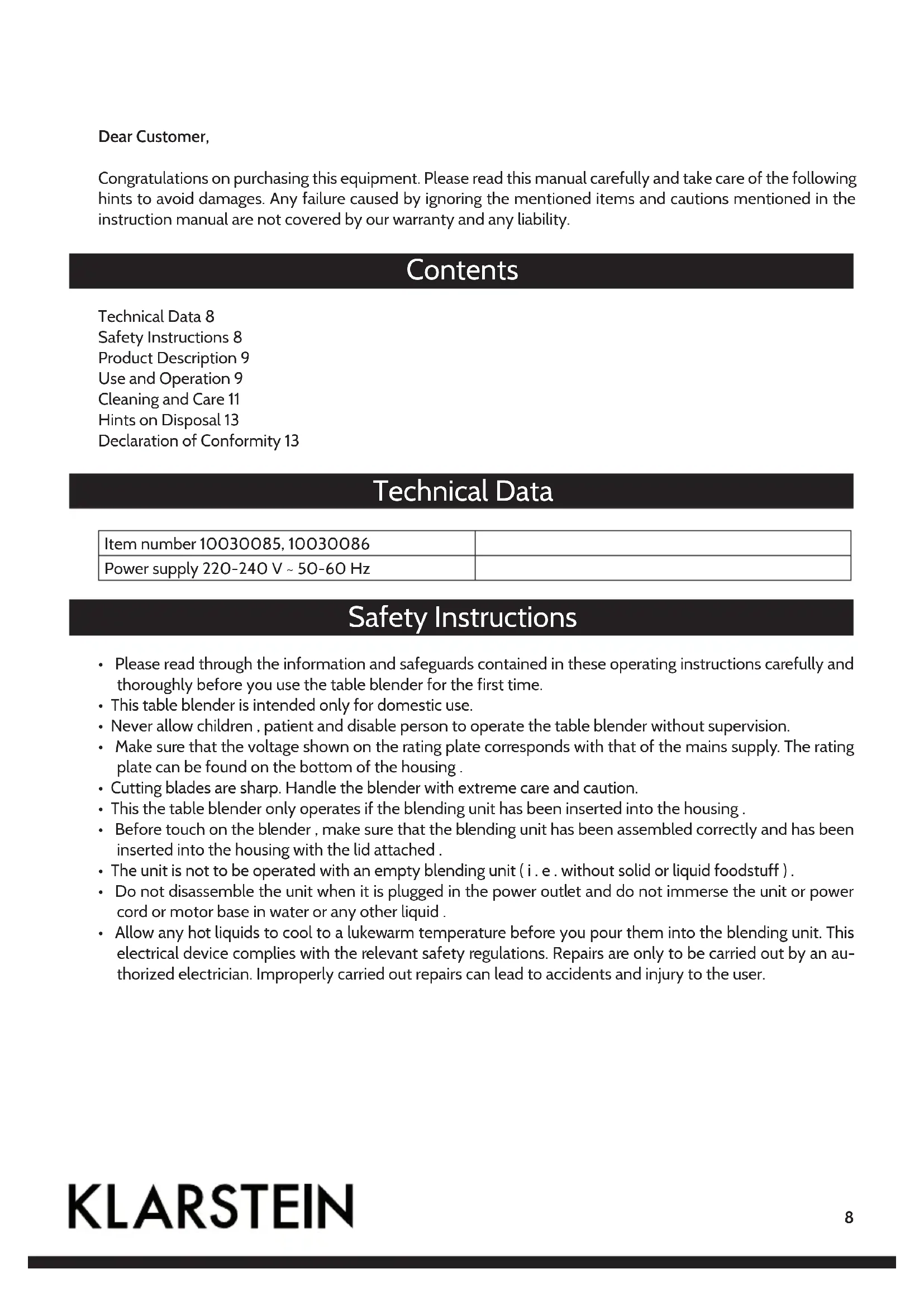 - Please read through the information and safeguards contained in these operating instructions carefully and thoroughly before you use the table blender for the first time.