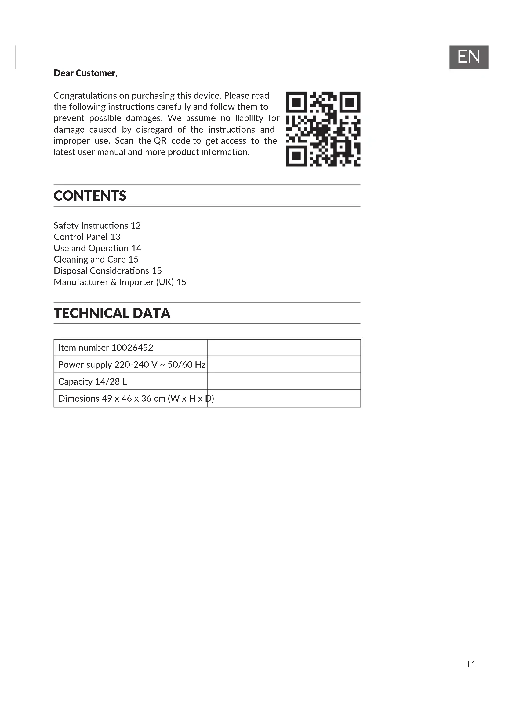 Dear Customer, Congratulaons on purchasing this device. Please read the following instrucons carefully and follow them to prevent possible damages. We assume no liability for damage caused by disregard of the instrucons and improper use. Scan the QR code to get access to the latest user manual and more product informaon. CONTENTS Safety Instrucons 12 Control Panel 13 Use and Operaon 14 Cleaning and Care 15 Disposal Consideraons 15 Manufacturer & Importer (UK) 15 TECHNICAL DATA Item number 10026452 Power supply 220-240 V ~ 50/60 Hz Capacity 14/28 L Dimesions 49 x 46 x 36 cm (W x H x D)12
