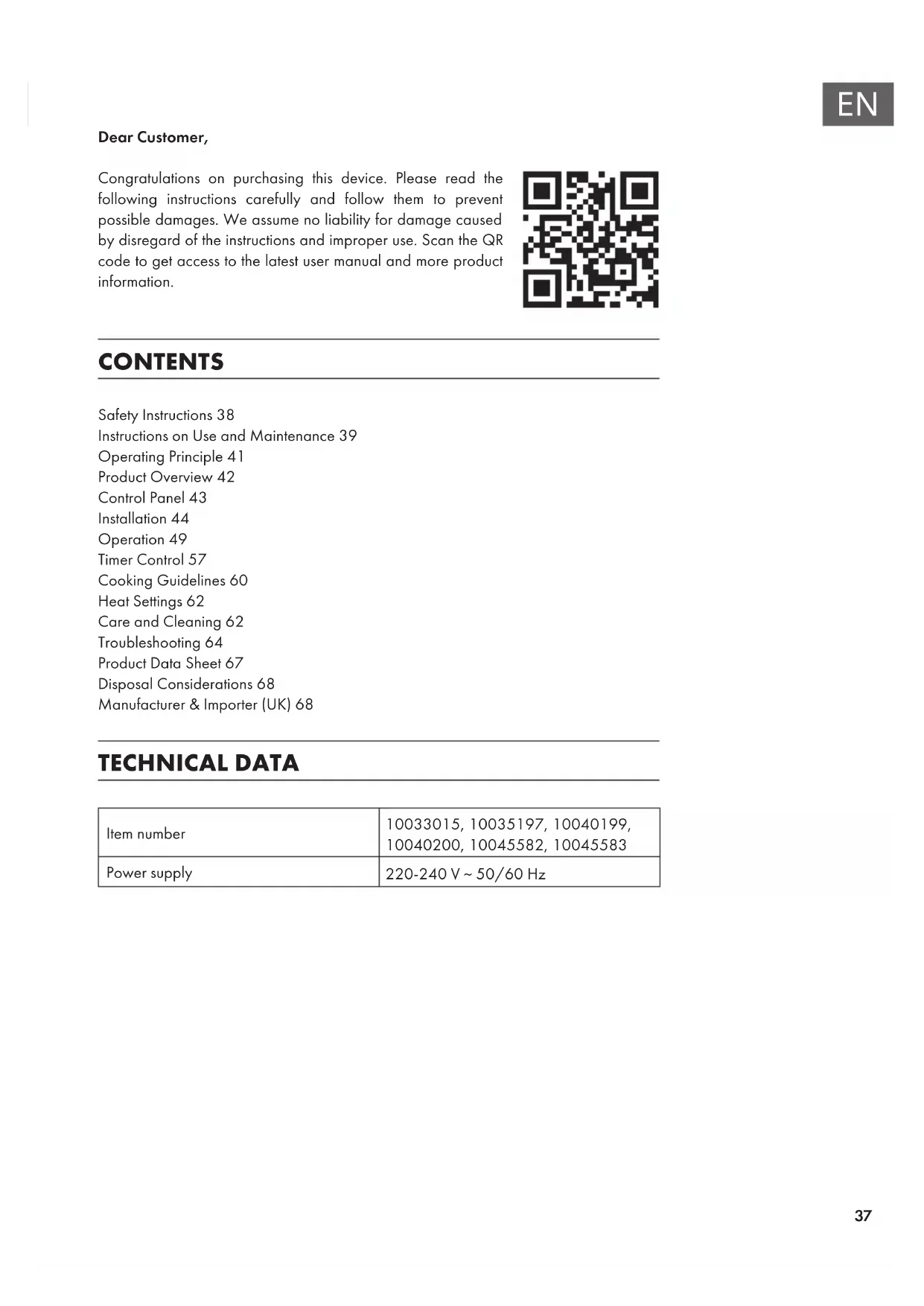Dear Customer, Congratulations on purchasing this device. Please read the following instructions carefully and follow them to prevent possible damages. We assume no liability for damage caused by disregard of the instructions and improper use. Scan the QR code to get access to the latest user manual and more product information. CONTENTS Safety Instructions38 Instructions on Use and Maintenance39 Operating Principle41 Product Overview42 Control Panel43 Installation44 Operation49 Timer Control57 Cooking Guidelines60 Heat Settings62 Care and Cleaning62 Troubleshooting64 Product Data Sheet67 Disposal Considerations68 Manufacturer & Importer (UK)68 TECHNICAL DATA Item number 10033015, 10035197, 10040199, 10040200, 10045582, 10045583 Power supply 220-240 V ~ 50/60 Hz38