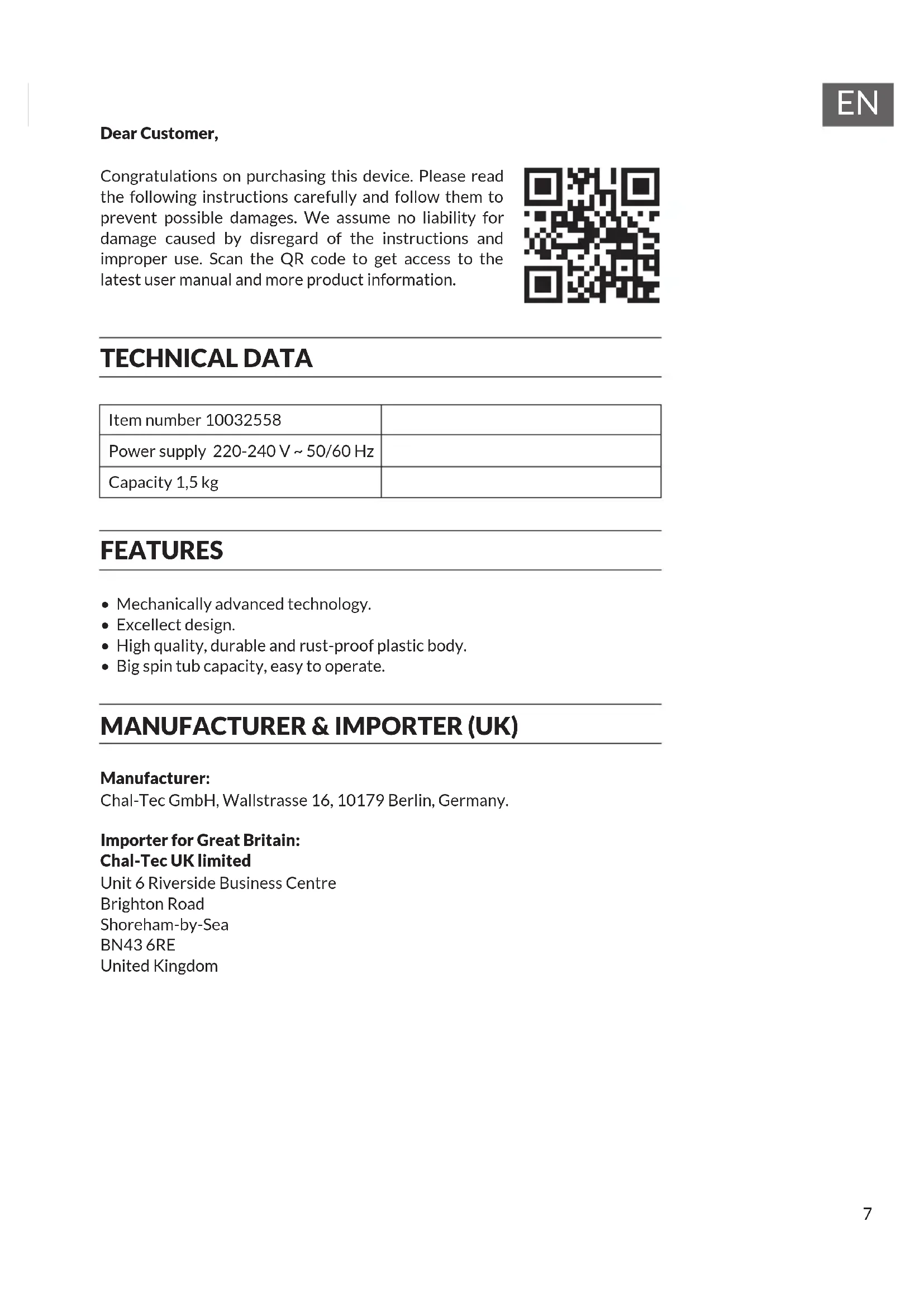 - Big spin tub capacity, easy to operate. MANUFACTURER & IMPORTER (UK) Manufacturer: Chal-Tec GmbH, Wallstrasse 16, 10179 Berlin, Germany. Importer for Great Britain: Chal-Tec UK limited Unit 6 Riverside Business Centre Brighton Road Shoreham-by-Sea BN43 6RE United Kingdom8