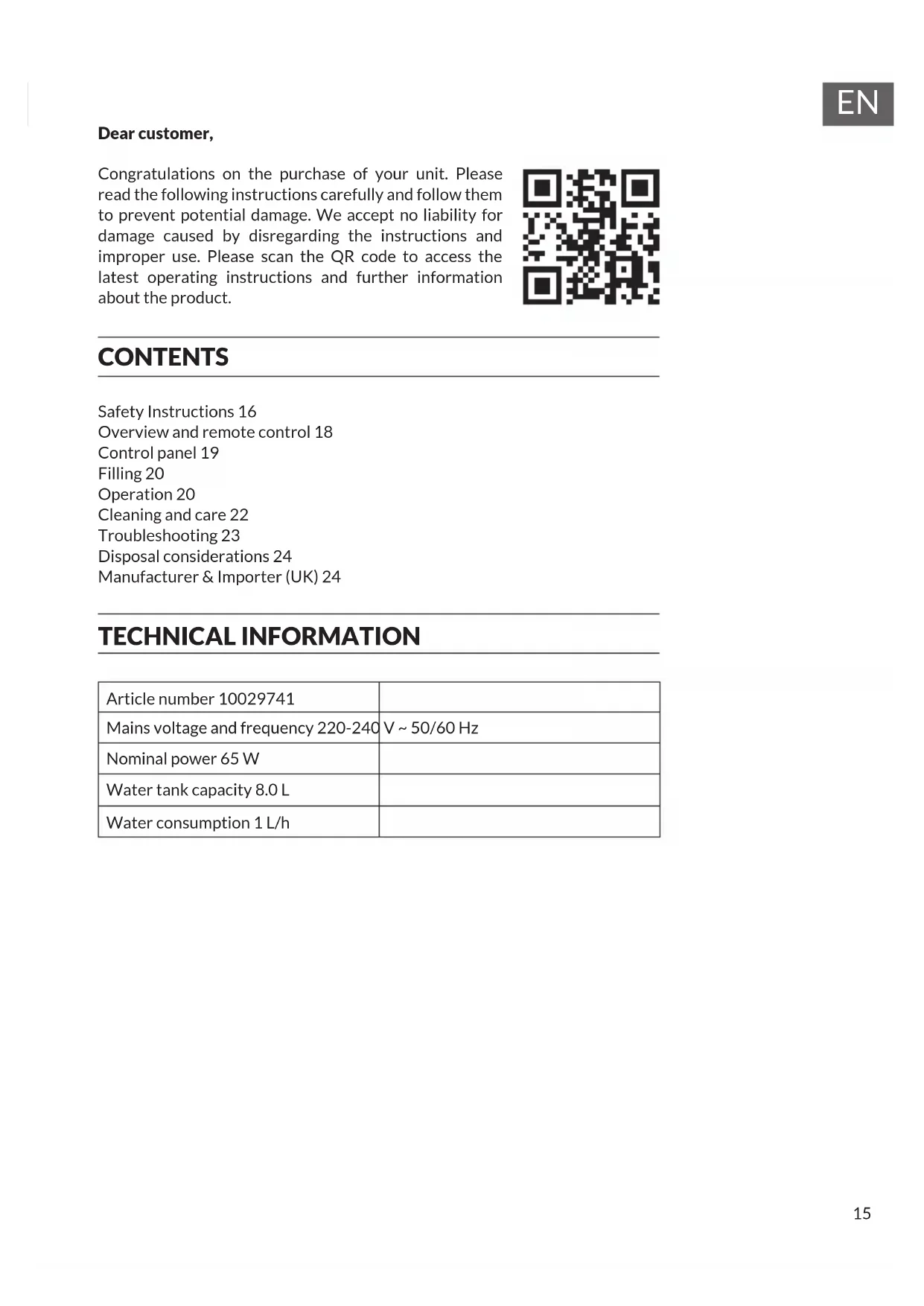 Dear customer, Congratulations on the purchase of your unit. Please read the following instructions carefully and follow them to prevent potential damage. We accept no liability for damage caused by disregarding the instructions and improper use. Please scan the QR code to access the latest operating instructions and further information about the product. CONTENTS Safety Instructions 16 Overview and remote control 18 Control panel 19 Filling 20 Operation 20 Cleaning and care 22 Troubleshooting 23 Disposal considerations 24 Manufacturer & Importer (UK) 24 TECHNICAL INFORMATION Article number 10029741 Mains voltage and frequency 220-240 V ~ 50/60 Hz Nominal power 65 W Water tank capacity 8.0 L Water consumption 1 L/h16