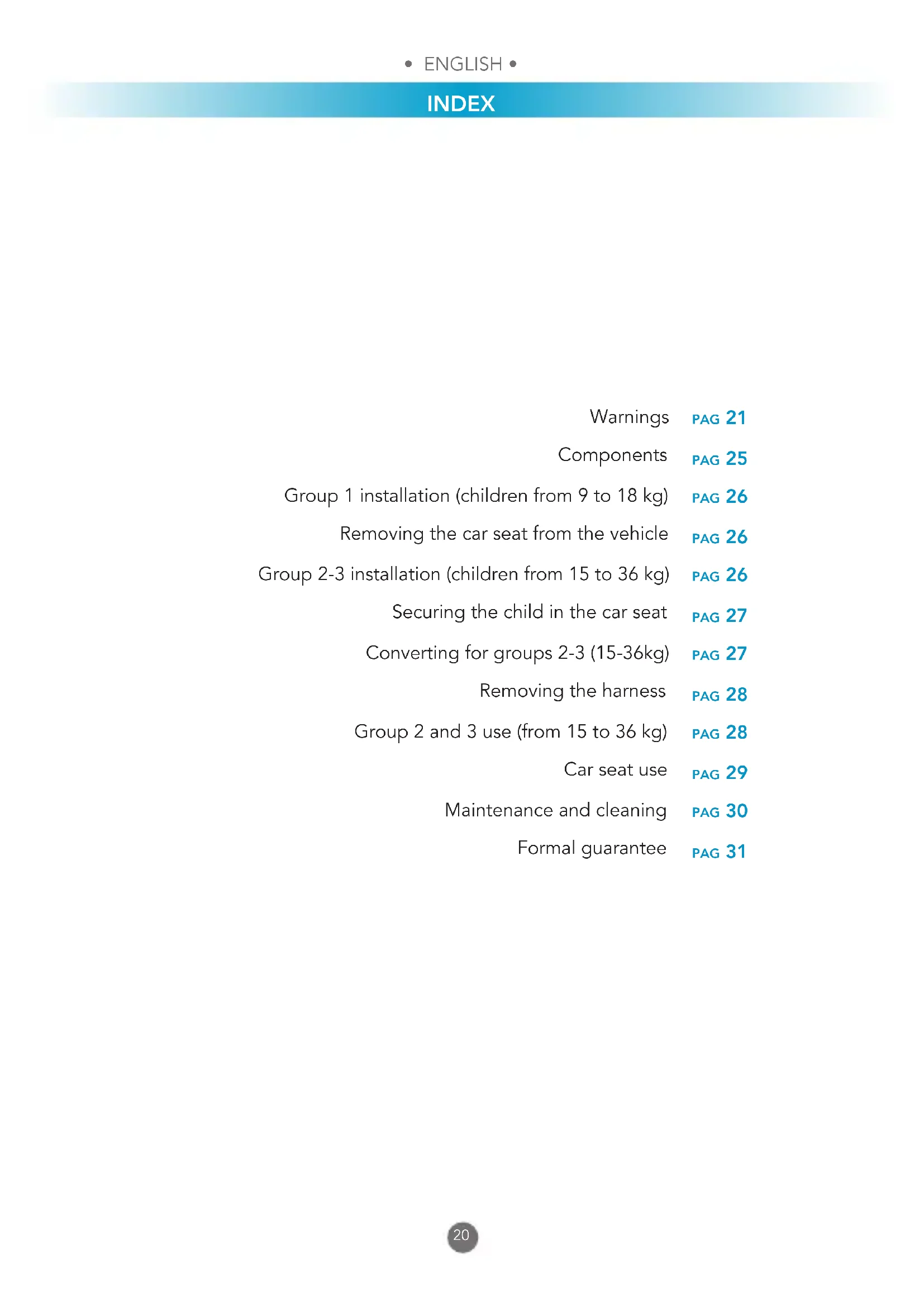 INDEX pag 21 pag 25 pag 26 pag 26 pag 26 pag 27 pag 27 pag 28 pag 28 pag 29 pag 30 pag 31 Warnings Components Group 1 installation (children from 9 to 18 kg) Removing the car seat from the vehicle Group 2-3 installation (children from 15 to 36 kg) Securing the child in the car seat Converting for groups 2-3 (15-36kg) Removing the harness Group 2 and 3 use (from 15 to 36 kg) Car seat use Maintenance and cleaning Formal guarantee• ENGLISH •