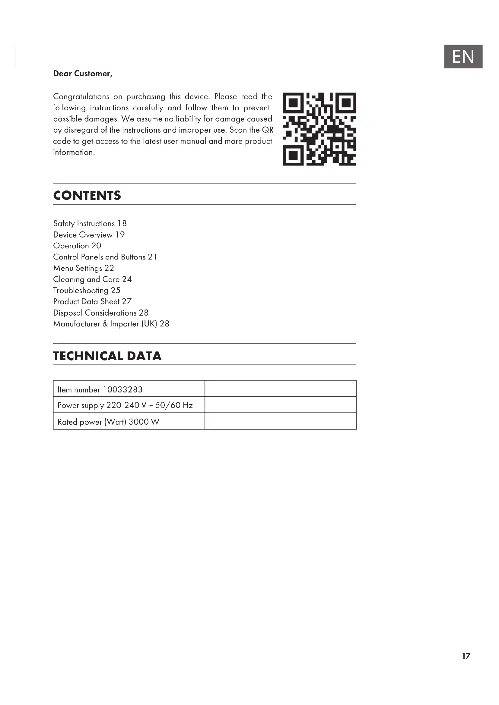 Dear Customer, Congratulations on purchasing this device. Please read the following instructions carefully and follow them to prevent possible damages. We assume no liability for damage caused by disregard of the instructions and improper use. Scan the QR code to get access to the latest user manual and more product information. CONTENTS TECHNICAL DATA Item number 10033283 Power supply 220-240 V ~ 50/60 Hz Rated power (Watt) 3000 W Safety Instructions18 Device Overview19 Operation20 Control Panels and Buttons21 Menu Settings22 Cleaning and Care24 Troubleshooting25 Product Data Sheet27 Disposal Considerations28 Manufacturer & Importer (UK)2818