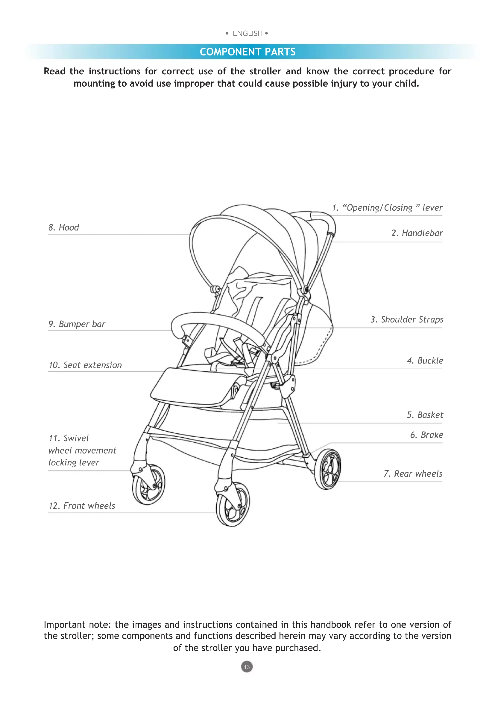 - ITALIANO • Read the instructions for correct use of the stroller and know the correct procedure for mounting to avoid use improper that could cause possible injury to your child. COMPONENT PARTS Important note: the images and instructions contained in this handbook refer to one version of the stroller; some components and functions described herein may vary according to the version of the stroller you have purchased.