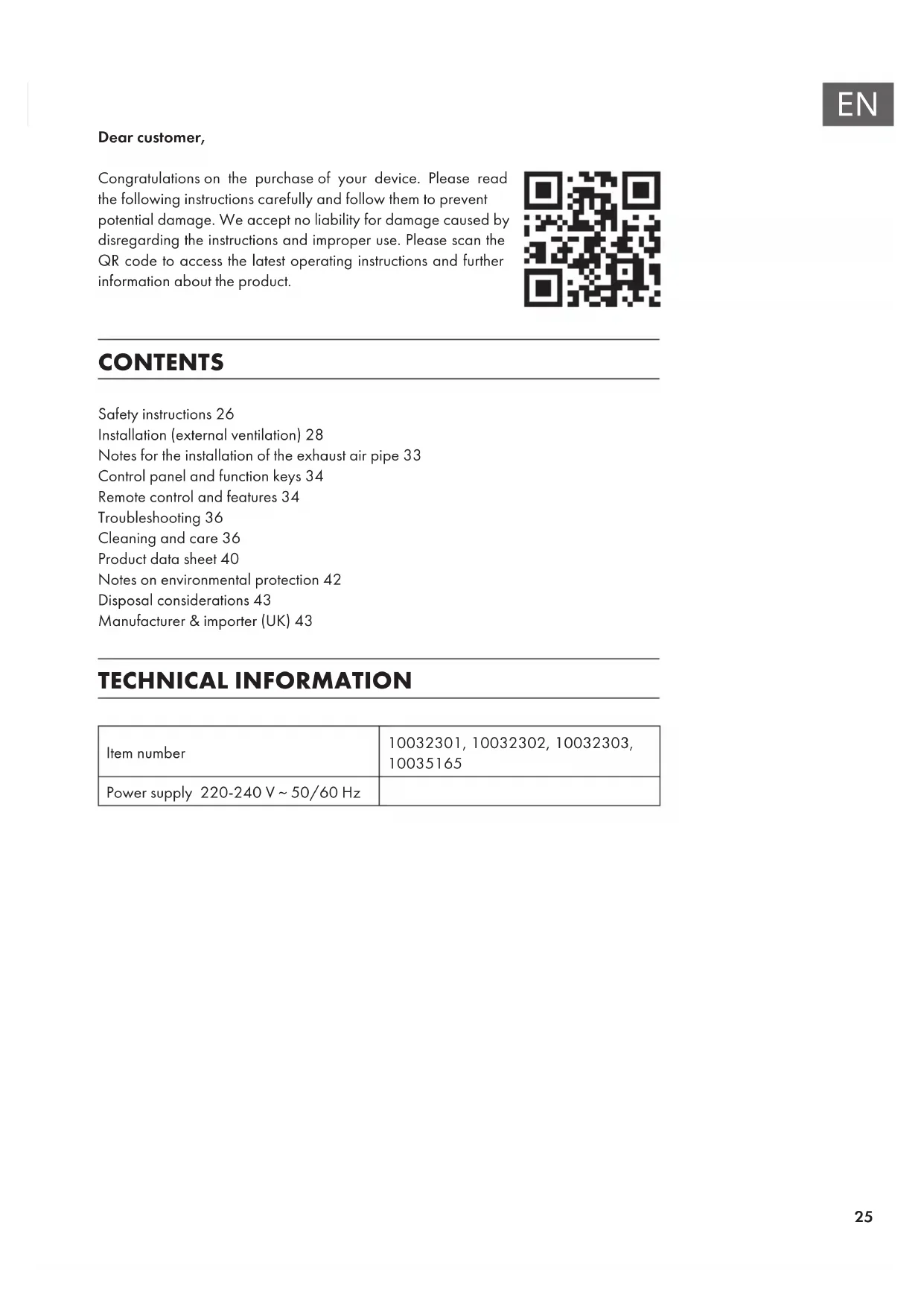 Dear customer, Congratulations on the purchase of your device. Please read the following instructions carefully and follow them to prevent potential damage. We accept no liability for damage caused by disregarding the instructions and improper use. Please scan the QR code to access the latest operating instructions and further information about the product. CONTENTS Safety instructions26 Installation (external ventilation)28 Notes for the installation of the exhaust air pipe33 Control panel and function keys34 Remote control and features34 Troubleshooting36 Cleaning and care36 Product data sheet40 Notes on environmental protection42 Disposal considerations43 Manufacturer & importer (UK)43 TECHNICAL INFORMATION Item number 10032301, 10032302, 10032303,