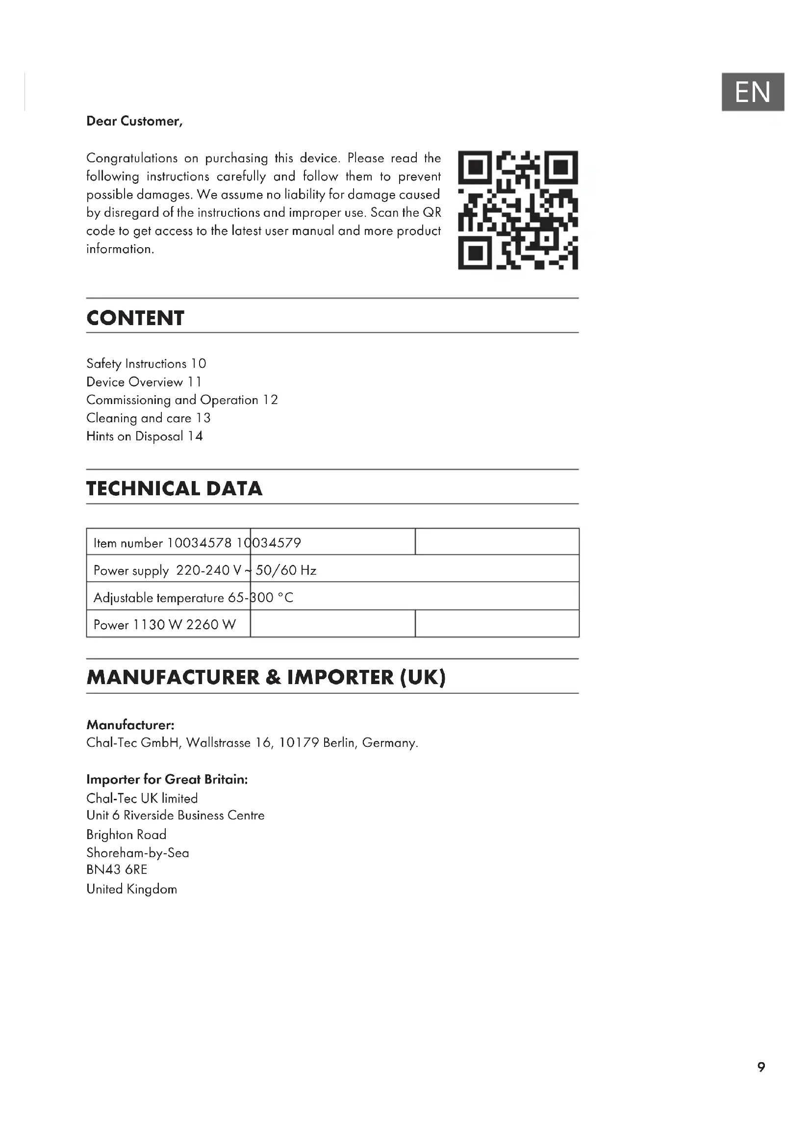 Dear Customer, Congratulations on purchasing this device. Please read the following instructions carefully and follow them to prevent possible damages. We assume no liability for damage caused by disregard of the instructions and improper use. Scan the QR code to get access to the latest user manual and more product information. CONTENT Safety Instructions10 Device Overview11 Commissioning and Operation12 Cleaning and care13 Hints on Disposal14 TECHNICAL DATA Item number 10034578 10034579 Power supply 220-240 V ~ 50/60 Hz Adjustable temperature 65-300°C Power 1130 W 2260 W MANUFACTURER & IMPORTER (UK) Manufacturer: Chal-Tec GmbH, Wallstrasse 16, 10179 Berlin, Germany. Importer for Great Britain: Chal-Tec UK limited Unit 6 Riverside Business Centre Brighton Road Shoreham-by-Sea BN43 6RE United Kingdom10