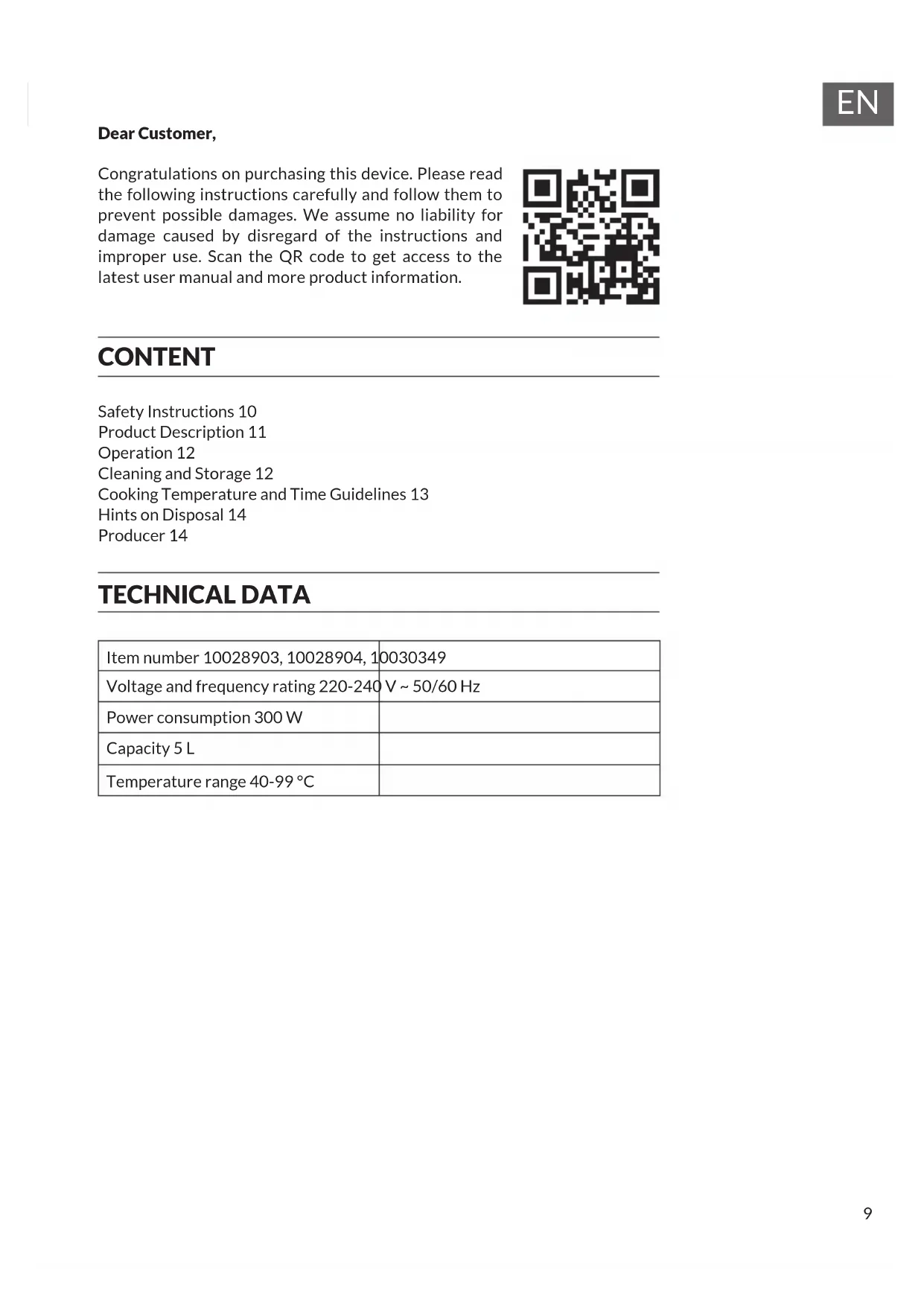 Dear Customer, Congratulations on purchasing this device. Please read the following instructions carefully and follow them to prevent possible damages. We assume no liability for damage caused by disregard of the instructions and improper use. Scan the QR code to get access to the latest user manual and more product information. CONTENT Safety Instructions 10 Product Description 11 Operation 12 Cleaning and Storage 12 Cooking Temperature and Time Guidelines 13 Hints on Disposal 14 Producer 14 TECHNICAL DATA Item number 10028903, 10028904, 10030349 Voltage and frequency rating 220-240 V ~ 50/60 Hz Power consumption 300 W Capacity 5 L Temperature range 40-99 °C10