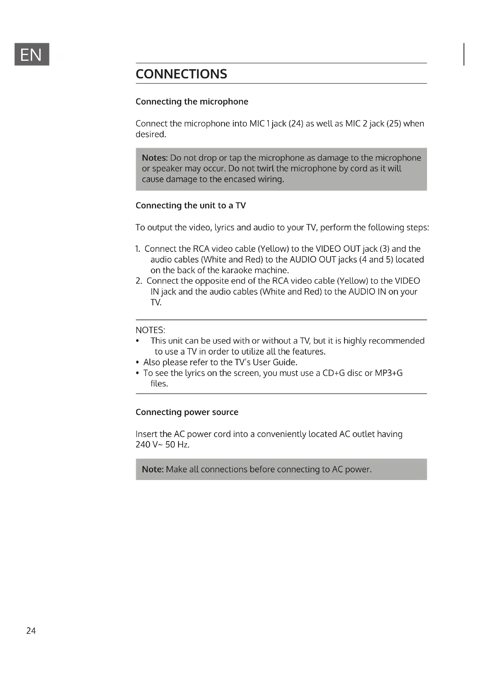 CONNECTIONS Connecting the microphone Connect the microphone into MIC 1 jack (24) as well as MIC 2 jack (25) when desired. Notes: Do not drop or tap the microphone as damage to the microphone or speaker may occur. Do not twirl the microphone by cord as it will cause damage to the encased wiring. Connecting the unit to a TV To output the video, lyrics and audio to your TV, perform the following steps: