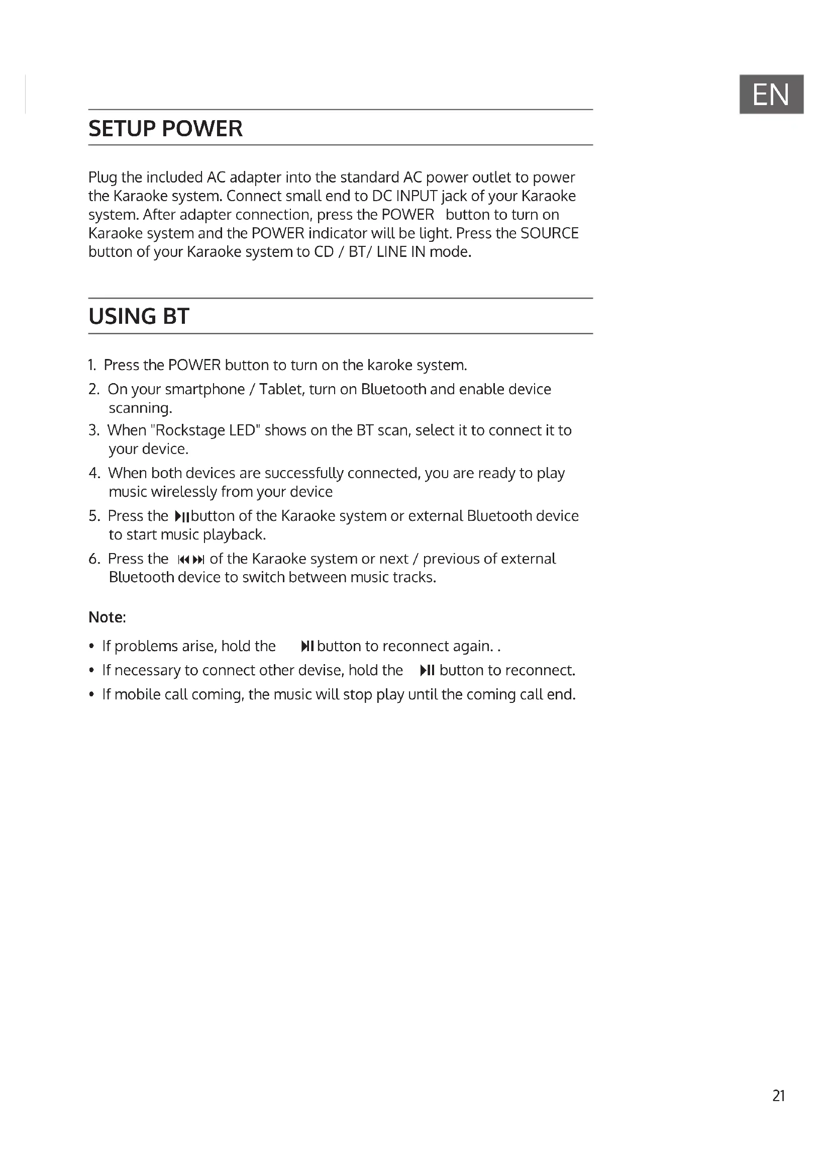 SETUP POWER Plug the included AC adapter into the standard AC power outlet to power the Karaoke system. Connect small end to DC INPUT jack of your Karaoke system. After adapter connection, press the POWER button to turn on Karaoke system and the POWER indicator will be light. Press the SOURCE button of your Karaoke system to CD / BT/ LINE IN mode. USING BT