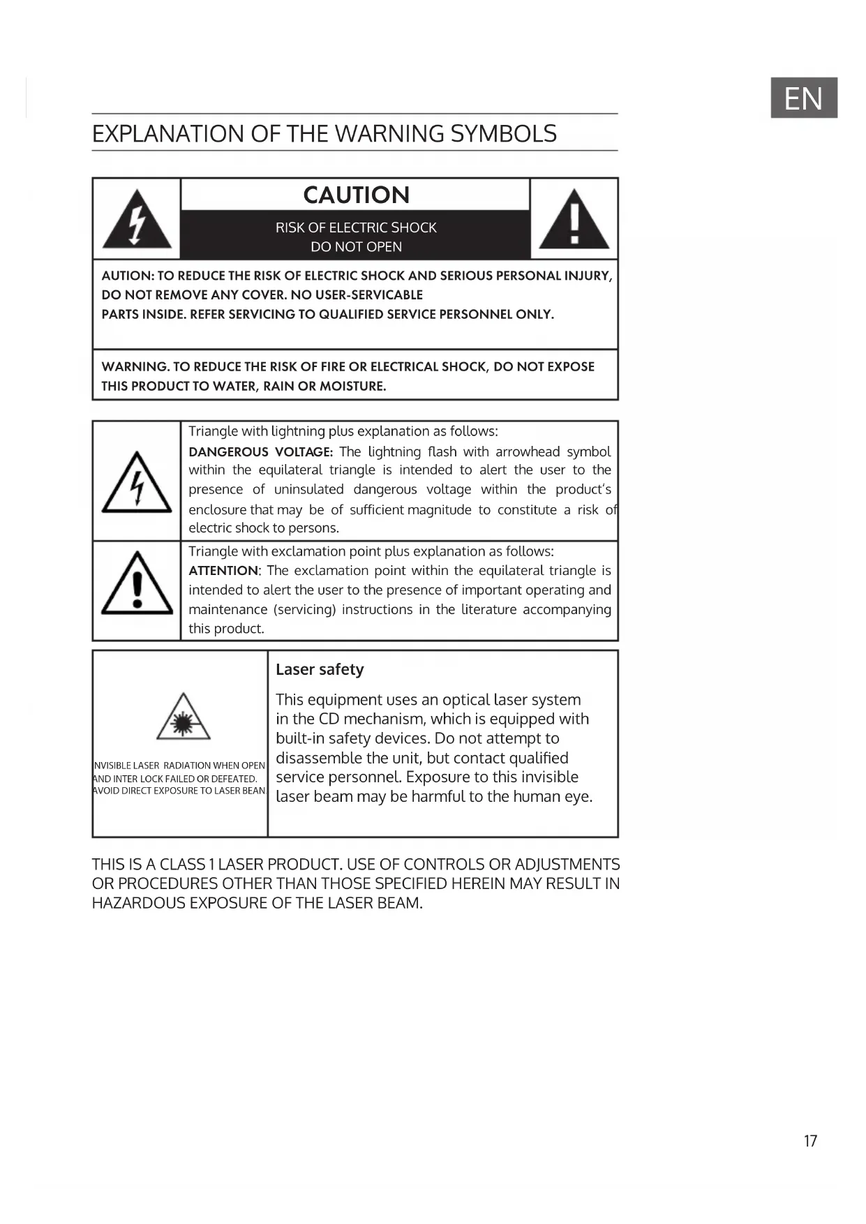 AUTION: TO REDUCE THE RISK OF ELECTRIC SHOCK AND SERIOUS PERSONAL INJURY, DO NOT REMOVE ANY COVER. NO USER-SERVICABLE PARTS INSIDE. REFER SERVICING TO QUALIFIED SERVICE PERSONNEL ONLY. WARNING. TO REDUCE THE RISK OF FIRE OR ELECTRICAL SHOCK, DO NOT EXPOSE THIS PRODUCT TO WATER, RAIN OR MOISTURE. Triangle with lightning plus explanation as follows: DANGEROUS VOLTAGE: The lightning ash with arrowhead symbol within the equilateral triangle is intended to alert the user to the presence of uninsulated dangerous voltage within the product‘s enclosure that may be of suicient magnitude to constitute a risk of electric shock to persons. Triangle with exclamation point plus explanation as follows: ATTENTION: The exclamation point within the equilateral triangle is intended to alert the user to the presence of important operating and maintenance (servicing) instructions in the literature accompanying this product. INVISIBLE LASER
