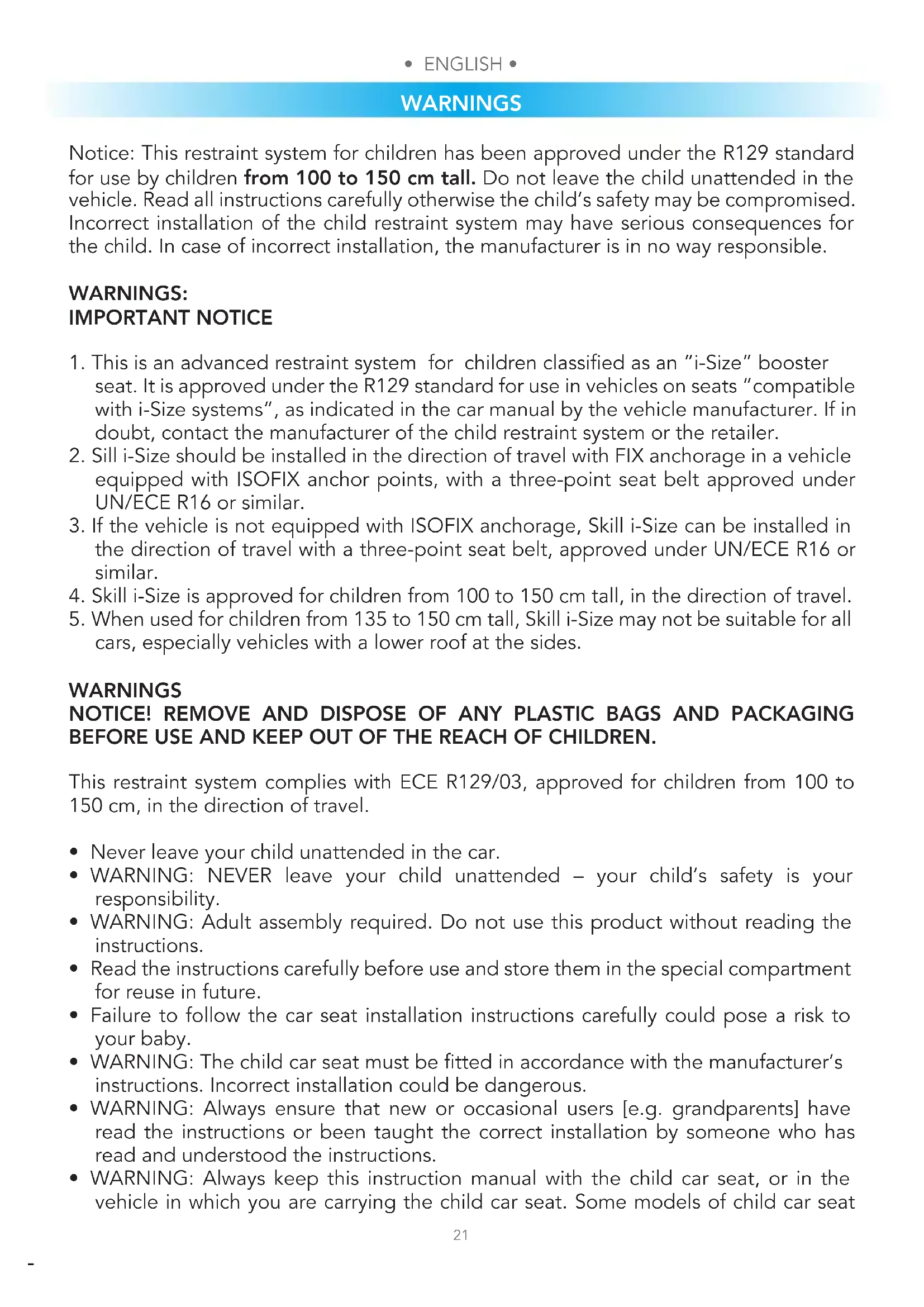 cars, especially vehicles with a lower roof at the sides. WARNINGS NOTICE! REMOVE AND DISPOSE OF ANY PLASTIC BAGS AND PACKAGING BEFORE USE AND KEEP OUT OF THE REACH OF CHILDREN. This restraint system complies with ECE R129/03, approved for children from 100 to 150 cm, in the direction of travel.
