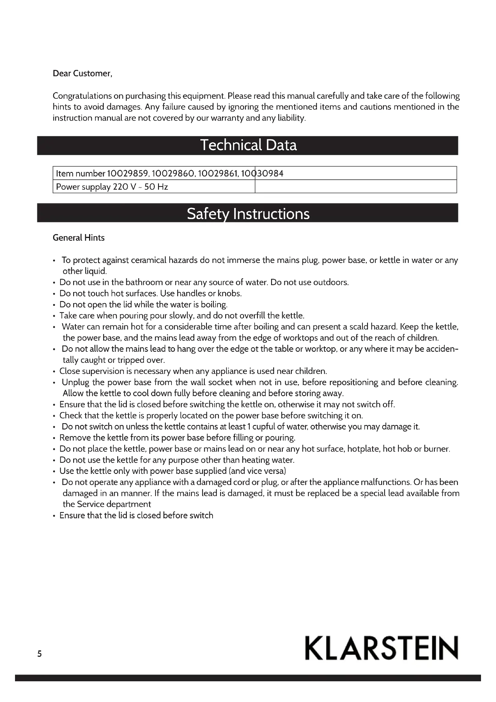 - To protect against ceramical hazards do not immerse the mains plug, power base, or kettle in water or any other liquid.