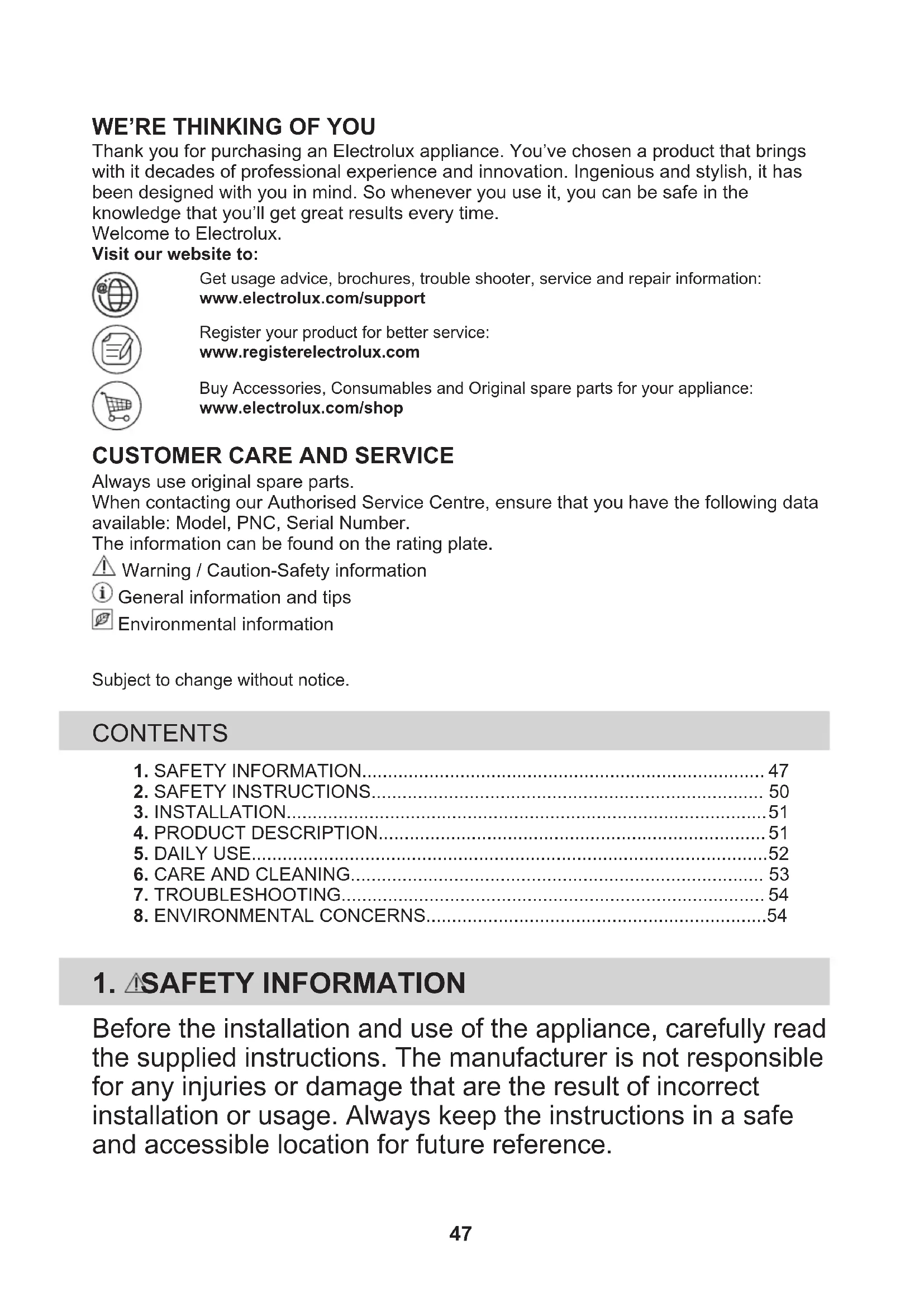 Always use original spare parts.When contacting our Authorised Service Centre, ensure that you have the following dataavailable: Model, PNC, Serial Number.The information can be found on the rating plate. Warning / Caution-Safety information General information and tips Environmental informationSubject to change without notice. CONTENTS