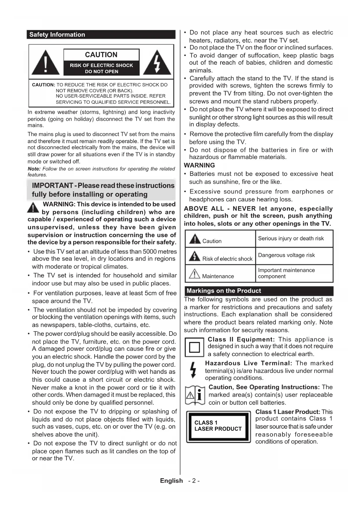 - Excessive sound pressure from earphones or headphones can cause hearing loss. ABOVE ALL - NEVER let anyone, especially children, push or hit the screen, push anything into holes, slots or any other openings in the TV. Caution Serious injury or death risk Risk of electric shock Dangerous voltage risk Maintenance Important maintenance component Markings on the Product The following symbols are used on the product as a marker for restrictions and precautions and safety instructions. Each explanation shall be considered where the product bears related marking only. Note such information for security reasons. Class II Equipment: This appliance is designed in such a way that it does not require a safety connection to electrical earth. Hazardous Live Terminal: The marked terminal(s) is/are hazardous live under normal operating conditions.