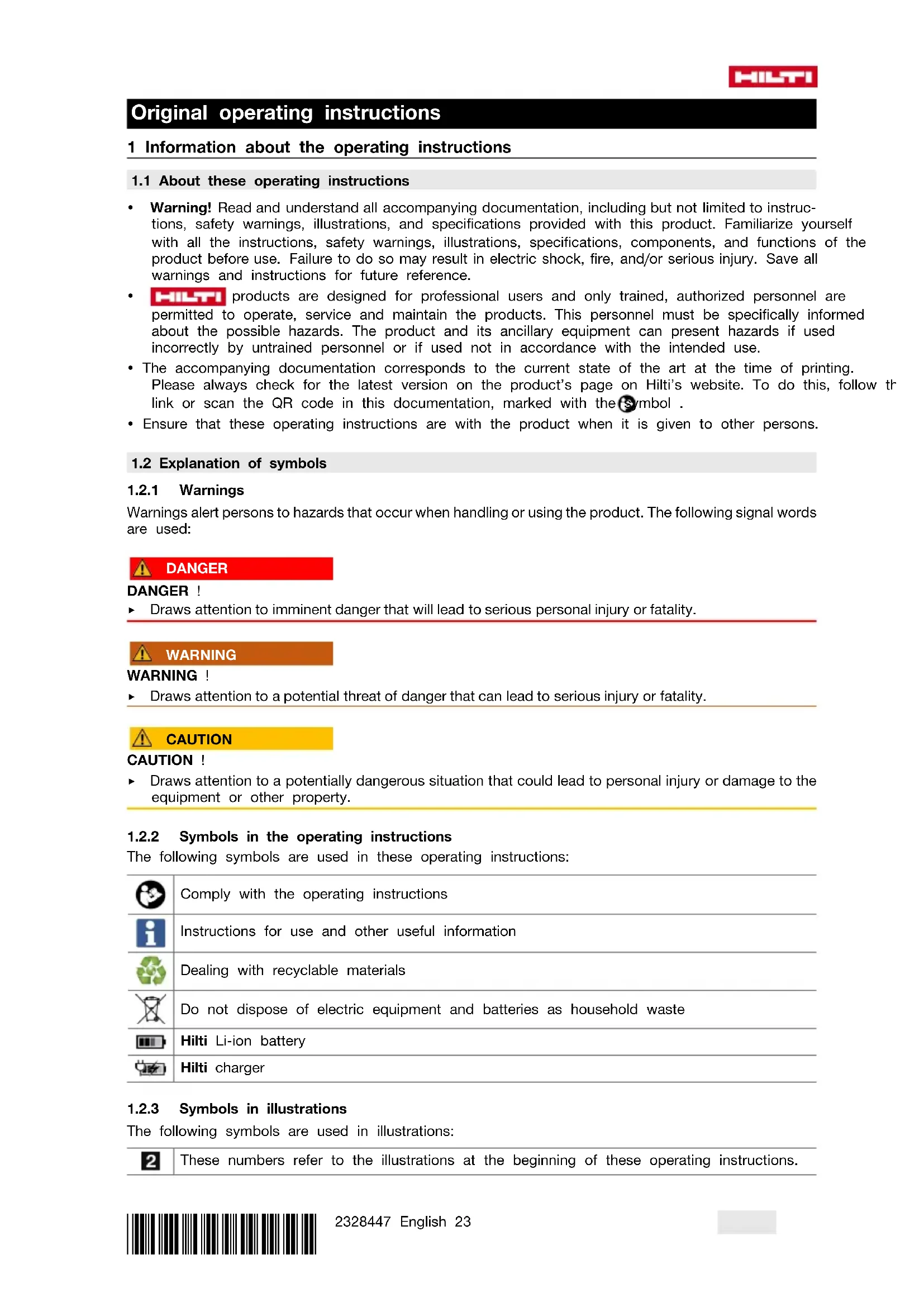 The following symbols are used in these operating instructions: Comply with the operating instructions Instructions for use and other useful information Dealing with recyclable materials Do not dispose of electric equipment and batteries as household waste Hilti Liion battery Hilti charger