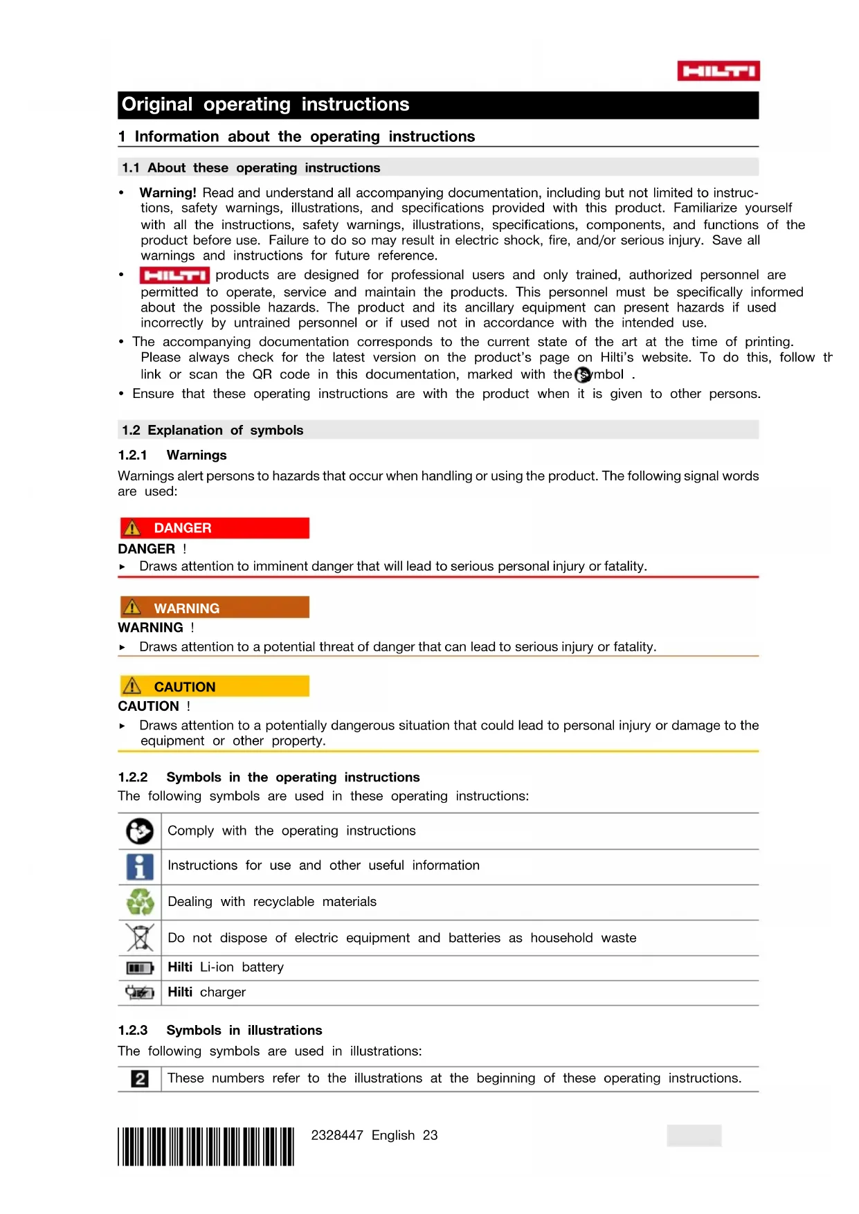 The following symbols are used in these operating instructions: Comply with the operating instructions Instructions for use and other useful information Dealing with recyclable materials Do not dispose of electric equipment and batteries as household waste Hilti Liion battery Hilti charger