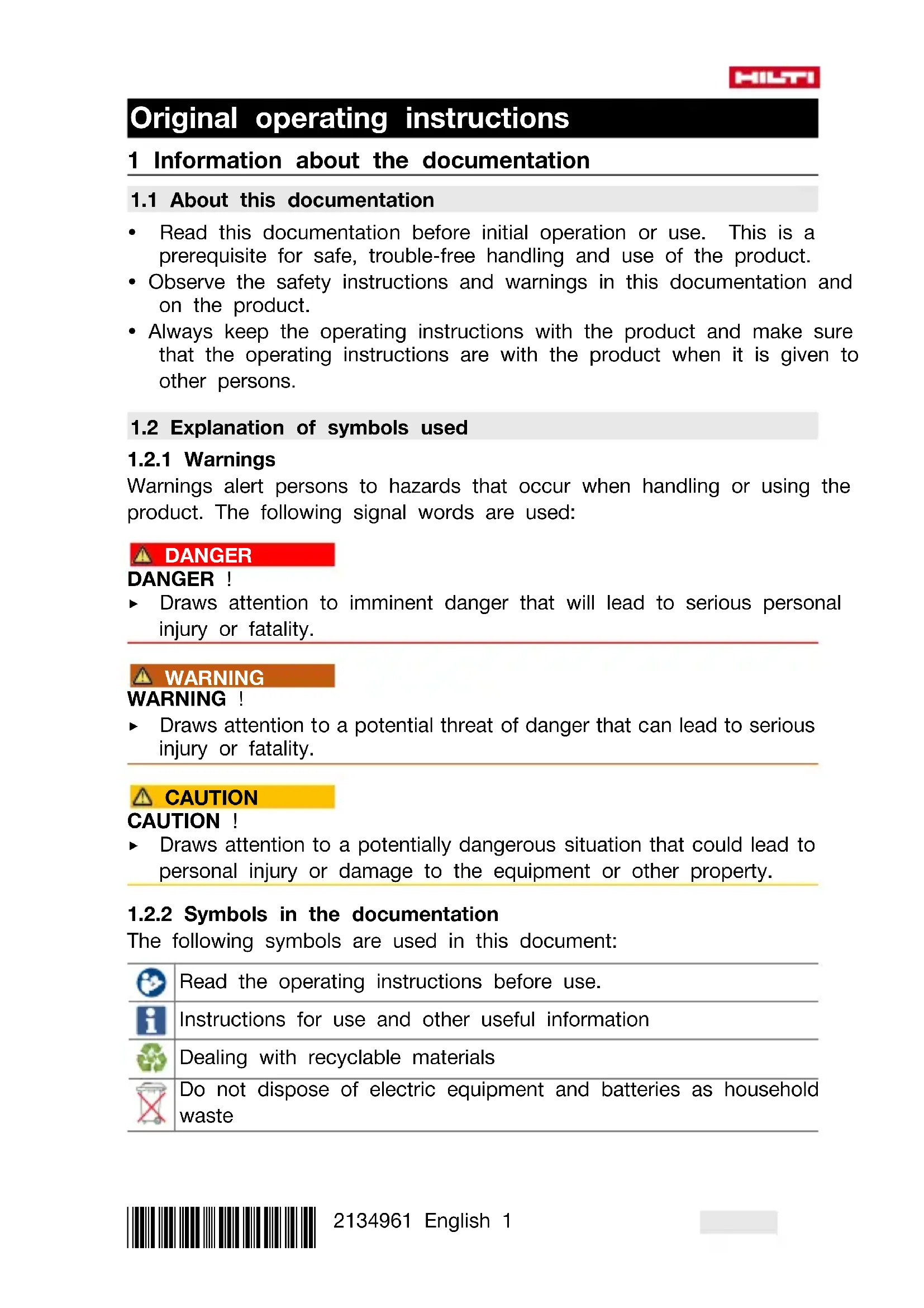 We declare, on our sole responsibility, that the product described here complies with the applicable directives and standards. A copy of the declaration issued by the certification department can be found at the end of this documentation. The technical documentation is filed here: Hilti Entwicklungsgesellschaft mbH | Tool Certification | Hiltistrasse 6 | 86916 Kaufering, Germany 2 Safety