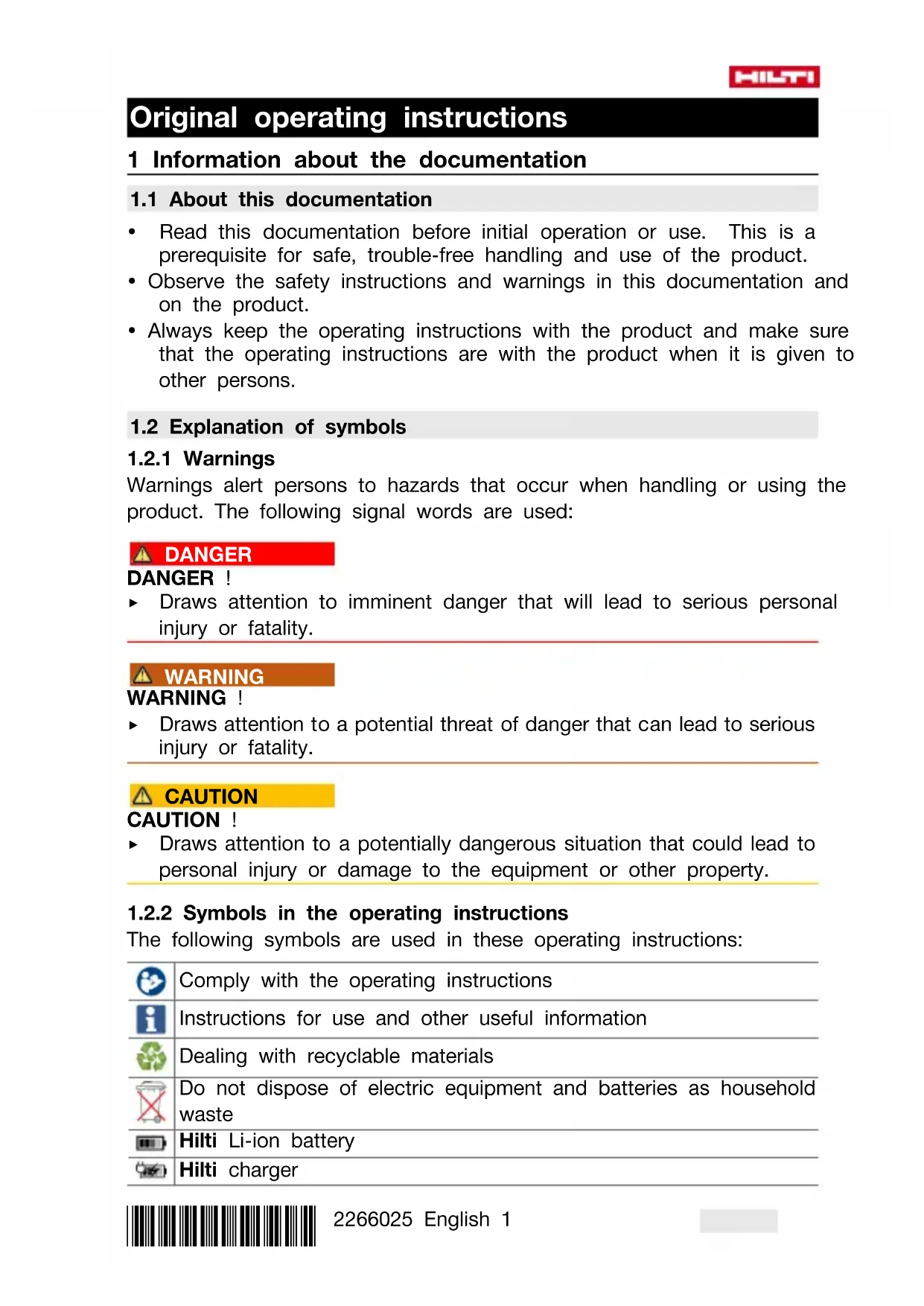The following symbols are used in these operating instructions: Comply with the operating instructions Instructions for use and other useful information Dealing with recyclable materials Do not dispose of electric equipment and batteries as household waste Hilti Liion battery Hilti charger2 English 2266025 *2266025*