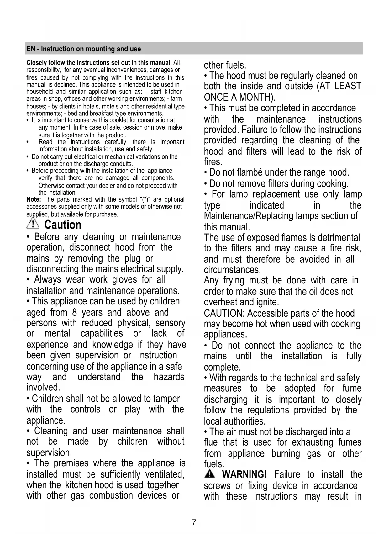 - For lamp replacement use only lamp type indicated in the Maintenance/Replacing lamps section of this manual. The use of exposed flames is detrimental to the filters and may cause a fire risk, and must therefore be avoided in all circumstances. Any frying must be done with care in order to make sure that the oil does not overheat and ignite. CAUTION: Accessible parts of the hood may become hot when used with cooking appliances.