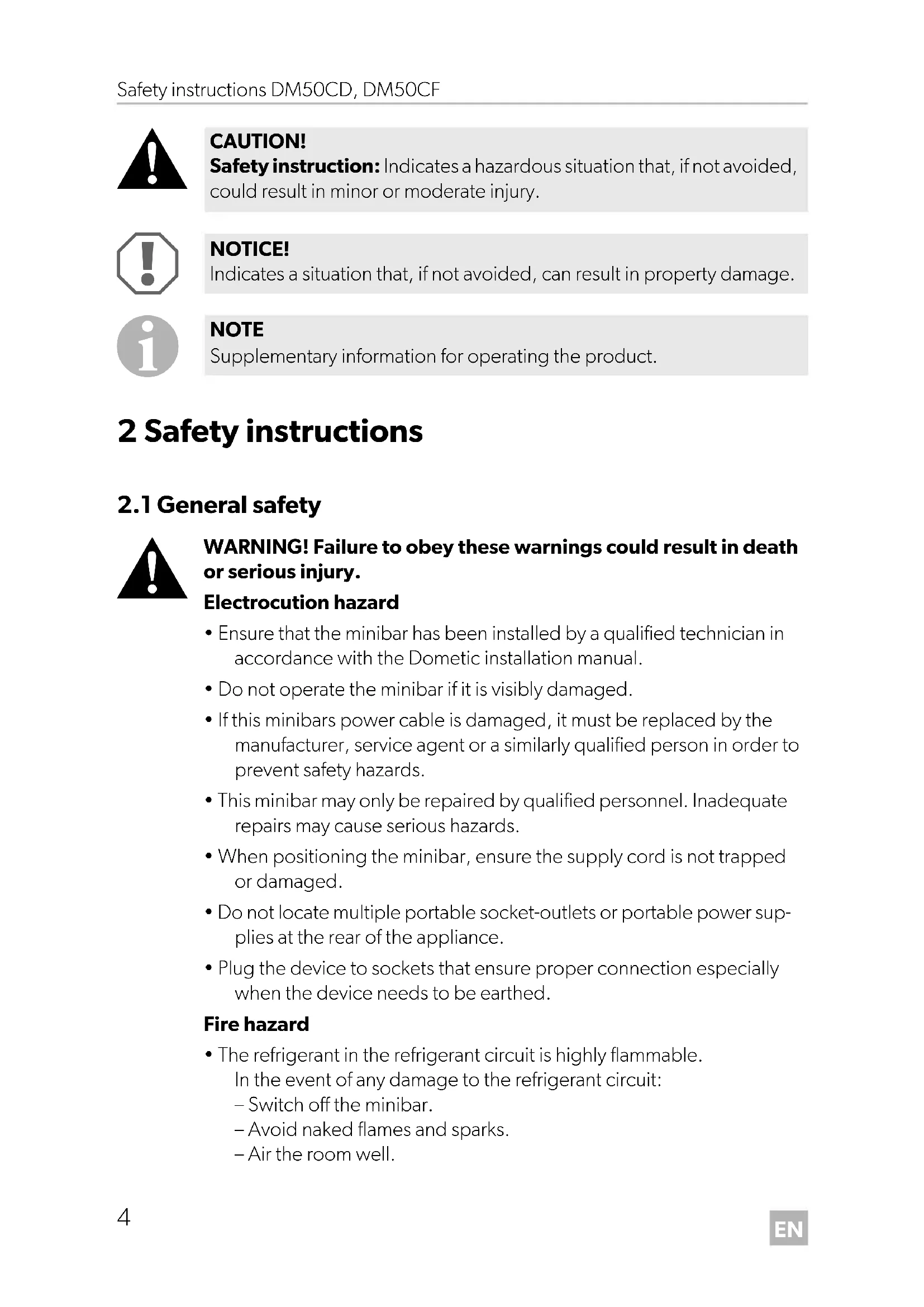 - The refrigerant in the refrigerant circuit is highly flammable. In the event of any damage to the refrigerant circuit: – Switch off the minibar. – Avoid naked flames and sparks. – Air the room well. CAUTION! Safety instruction: Indicates a hazardous situation that, if not avoided, could result in minor or moderate injury. NOTICE! Indicates a situation that, if not avoided, can result in property damage. NOTE Supplementary information for operating the product.EN DM50CD, DM50CF Safety instructions