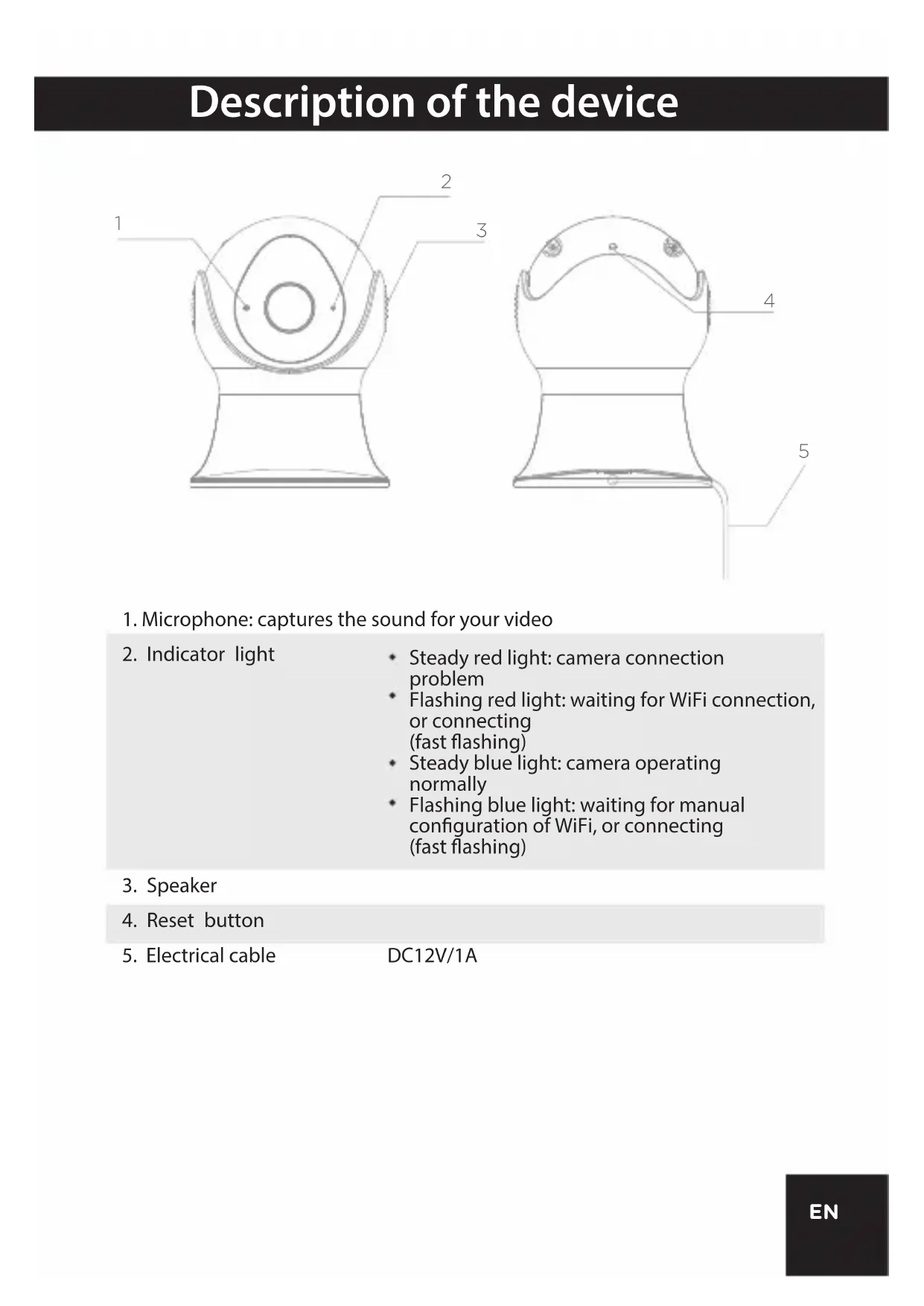 Description of the device ENEN 1 Connect the camera to the mains, making sure to push the cable home. The red indicator light starts to ash. After a few seconds, you will hear a beep. This indicates that the camera can be connected to WiFi via your smartphone or tablet. 2 Download the free DiO One application and create your account. The DiO camera are also compatble with the app “my Chacon” 3 Follow the instructions in the application to connect the camera to WiFi. Make sure your WiFi network is available. Add the camera to the application by clicking to the “+”, choose the device to add and the select the way to proceed (Scan QR code or smart conguration).