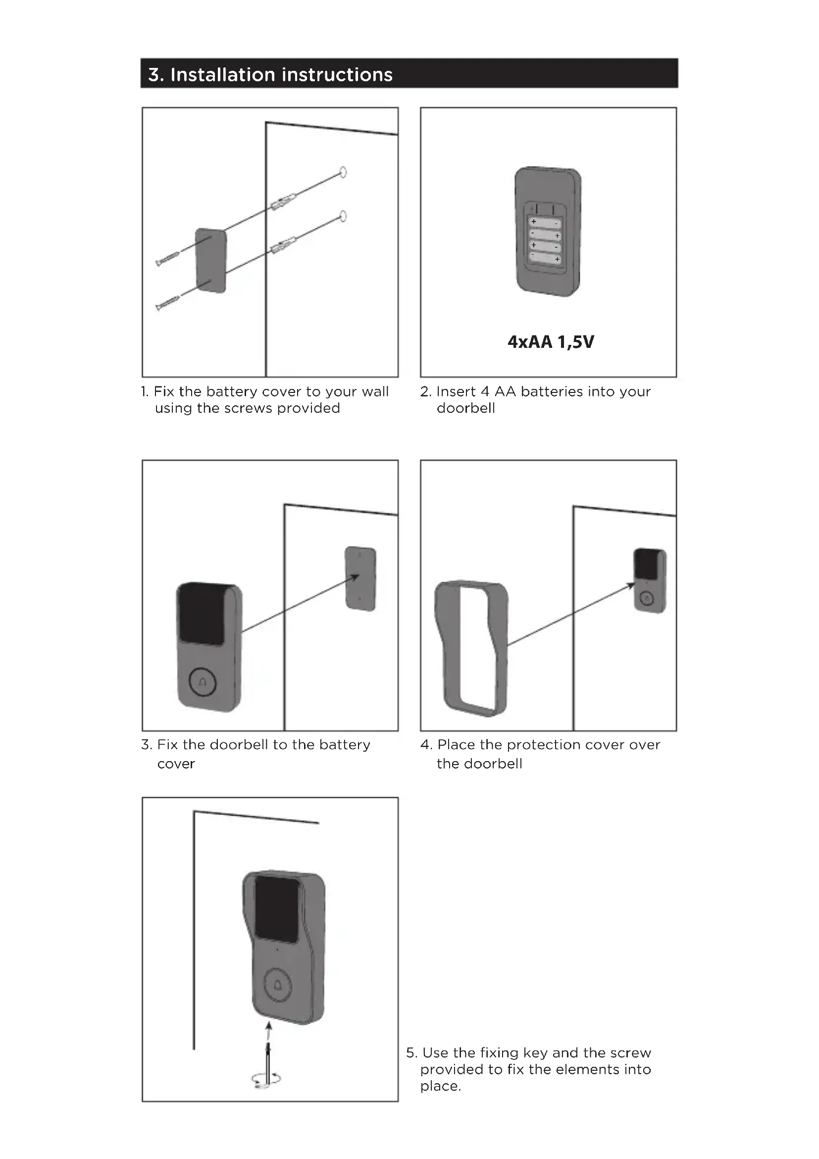 name Micro LED indicator Button Lens Micro LED indicator Button Reset button DiOBELL-B01 DiOBELL-B02 DiOBELL-B01 + B02 Note In order to reset the device, press and hold the reset button for 5 seconds. The doorbell rings when the process is complete.3. Installation instructions