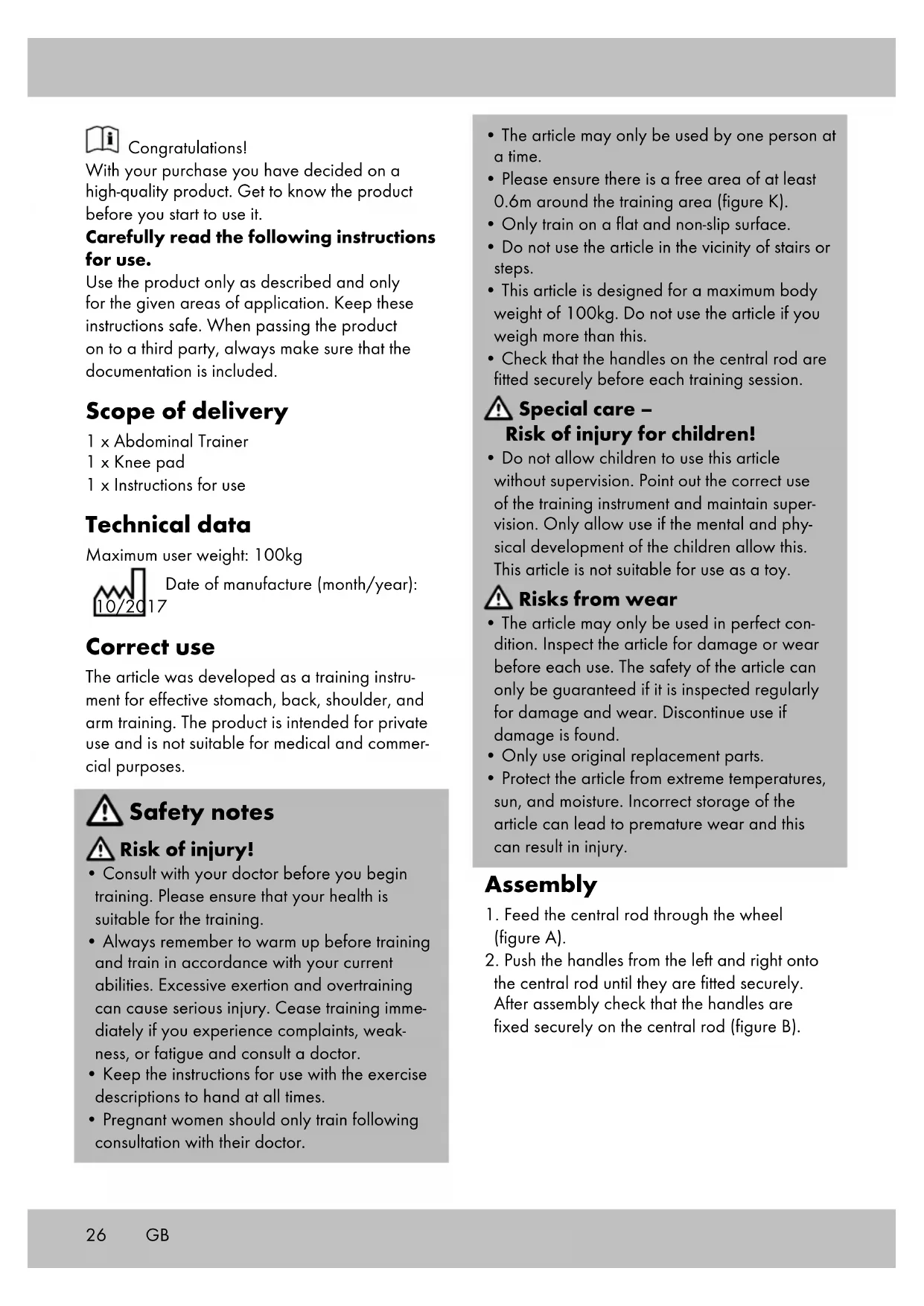 IT/CH25 In qualsiasi caso vi consiglieremo per le vostre esigenze specifiche. Il periodo di garanzia non viene prolungato a seguito di riparazioni effettuate in garanzia, secondo il diritto di garanzia o per correntezza commerciale. Lo stesso vale anche per le parti sostituite o riparate. Le riparazioni dopo la scadenza della garanzia verranno effettuate a pagamento. IAN: 292889 Assistenza Svizzera Tel.: 0842 665566 (0,08 CHF/Min., telefonia mobile max. 0,40 CHF/Min.) E-Mail: deltasport@lidl.ch IT/CH26 Congratulations! With your purchase you have decided on a high-quality product. Get to know the product before you start to use it. Carefully read the following instructions for use. Use the product only as described and only for the given areas of application. Keep these instructions safe. When passing the product on to a third party, always make sure that the documentation is included. Scope of delivery 1 x Abdominal Trainer 1 x Knee pad 1 x Instructions for use Technical data Maximum user weight: 100kg Date of manufacture (month/year): 10/2017 Correct use The article was developed as a training instru- ment for effective stomach, back, shoulder, and arm training. The product is intended for private use and is not suitable for medical and commer- cial purposes. Safety notes Risk of injury!