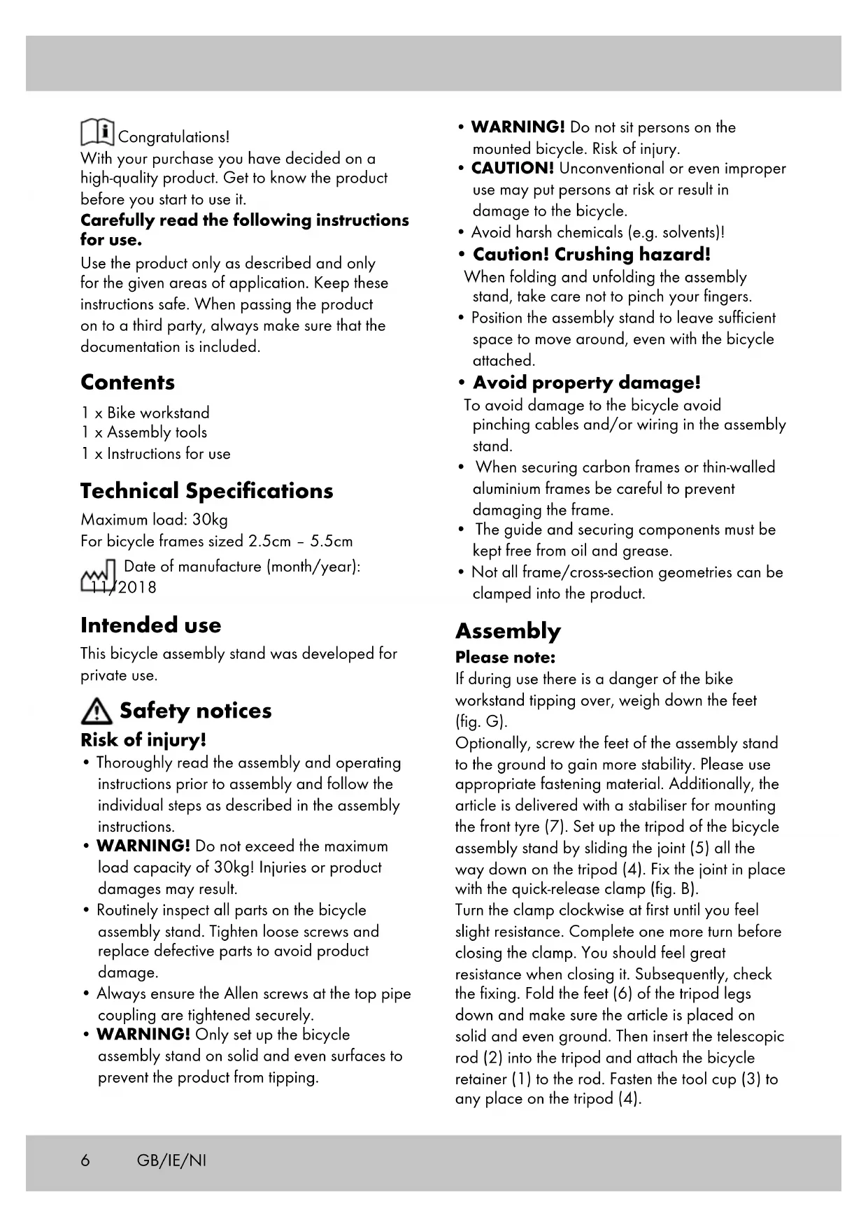 Congratulations! With your purchase you have decided on a high-quality product. Get to know the product before you start to use it. Carefully read the following instructions for use. Use the product only as described and only for the given areas of application. Keep these instructions safe. When passing the product on to a third party, always make sure that the documentation is included. Contents 1 x Bike workstand 1 x Assembly tools 1 x Instructions for use Technical Specifications Maximum load: 30kg For bicycle frames sized 2.5cm – 5.5cm Date of manufacture (month/year): 11/2018 Intended use This bicycle assembly stand was developed for private use. Safety notices Risk of injury!
