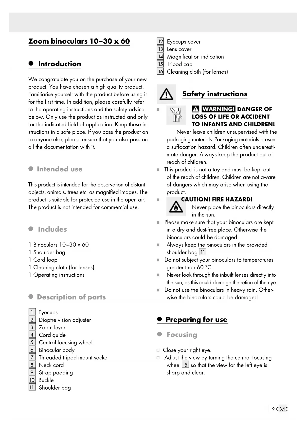 TO INFANTS AND CHILDREN! Never leave children unsupervised with the packaging materials. Packaging materials present a suffocation hazard. Children often underesti- mate danger. Always keep the product out of reach of children. This product is not a toy and must be kept out of the reach of children. Children are not aware of dangers which may arise when using the product. CAUTION! FIRE HAZARD! Never place the binoculars directly in the sun. Please make sure that your binoculars are kept in a dry and dust-free place. Otherwise the binoculars could be damaged.