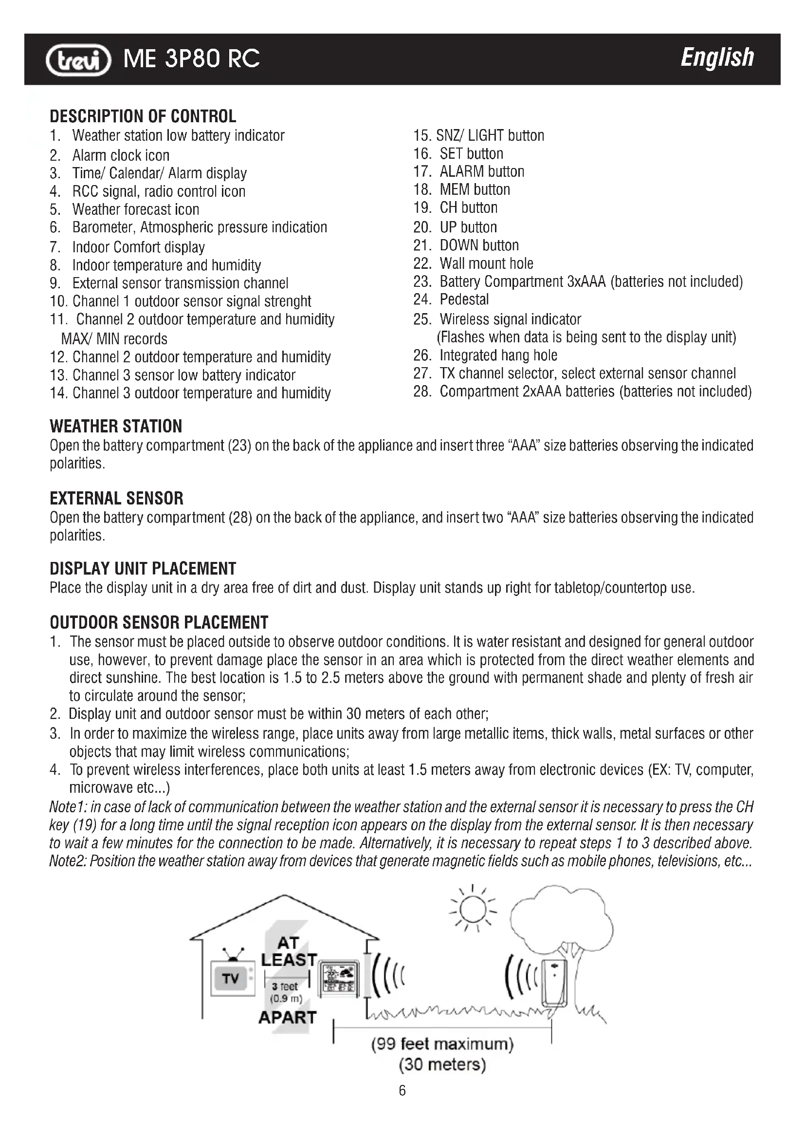 3. In order to maximize the wireless range, place units away from large metallic items, thick walls, metal surfaces or other objects that may limit wireless communications; 4. To prevent wireless interferences, place both units at least 1.5 meters away from electronic devices (EX: TV, computer, microwave etc...) Note1: in case of lack of communication between the weather station and the external sensor it is necessary to press the CH key (19) for a long time until the signal reception icon appears on the display from the external sensor. It is then necessary to wait a few minutes for the connection to be made. Alternatively, it is necessary to repeat steps 1 to 3 described above. Note2: Position the weather station away from devices that generate magnetic fields such as mobile phones, televisions, etc...