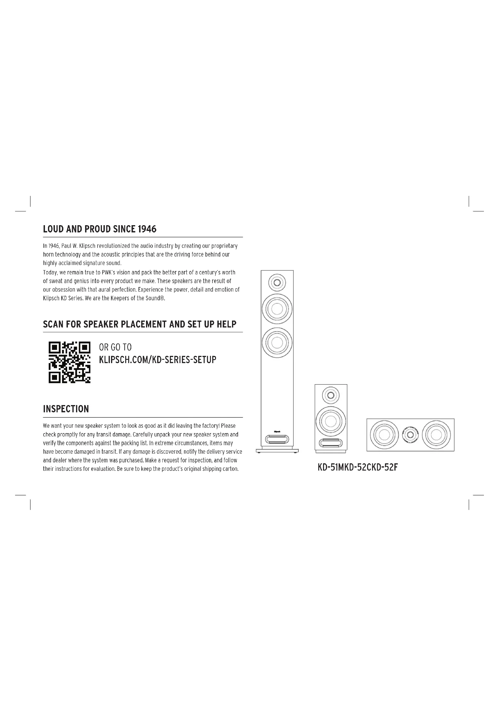 In 1946, Paul W. Klipsch revolutionized the audio industry by creating our proprietary horn technology and the acoustic principles that are the driving force behind our highly acclaimed signature sound. Today, we remain true to PWK’s vision and pack the better part of a century’s worth of sweat and genius into every product we make. These speakers are the result of our obsession with that aural perfection. Experience the power, detail and emotion of Klipsch KD Series. We are the Keepers of the Sound®. We want your new speaker system to look as good as it did leaving the factory! Please check promptly for any transit damage. Carefully unpack your new speaker system and verify the components against the packing list. In extreme circumstances, items may have become damaged in transit. If any damage is discovered, notify the delivery service and dealer where the system was purchased. Make a request for inspection, and follow their instructions for evaluation. Be sure to keep the product’s original shipping carton.